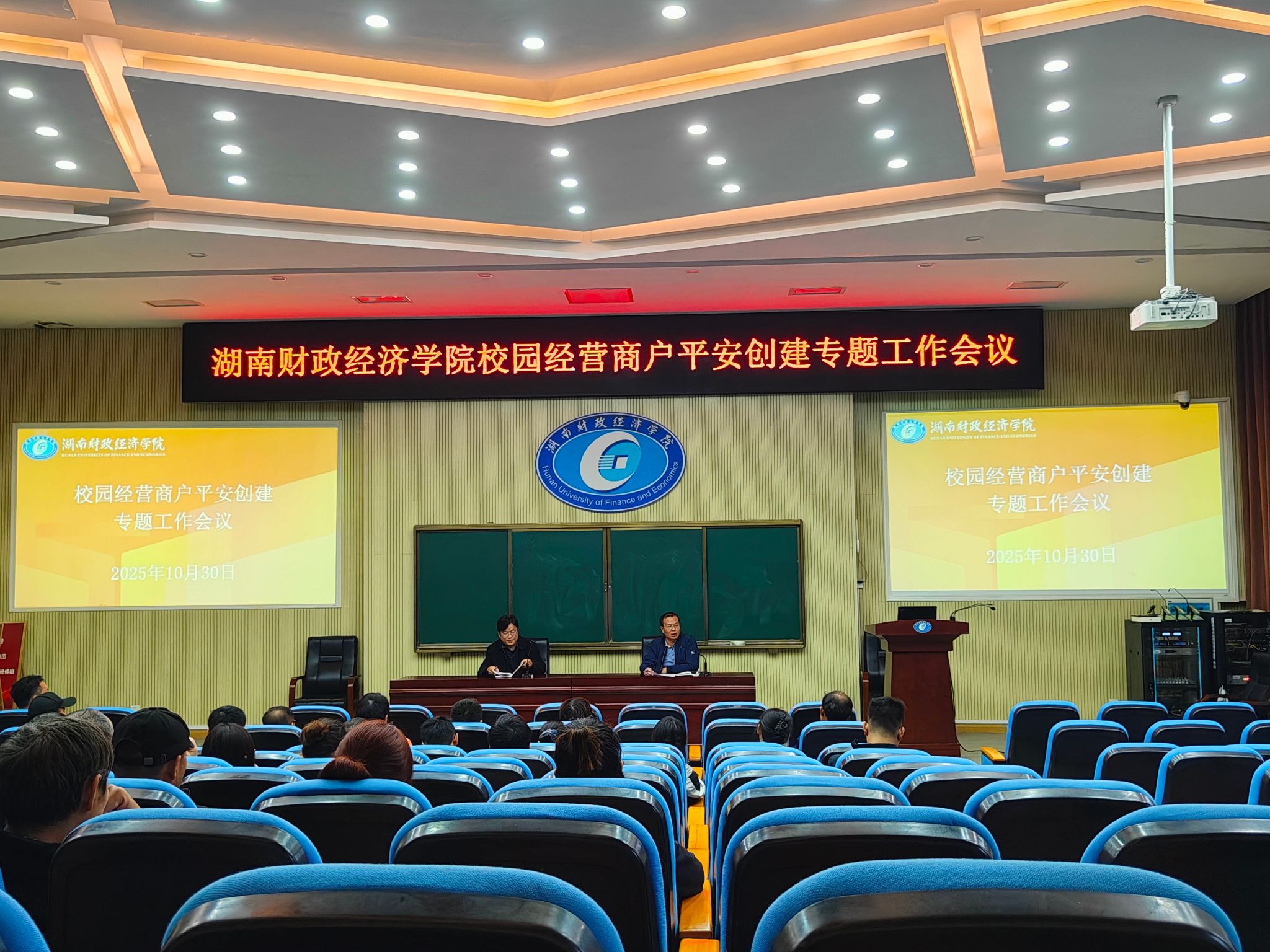 为进一步压实校园经营商户安全主体责任,筑牢校园安全屏障,全力推进平安校园创建工作走深走实,2025年10月30日下午,学校保卫部联合后勤处,组织全体校园经营商户召开平安创建专题工作会议。各商户负责人悉数参会,会议由保卫部负责人郭志伟主持。