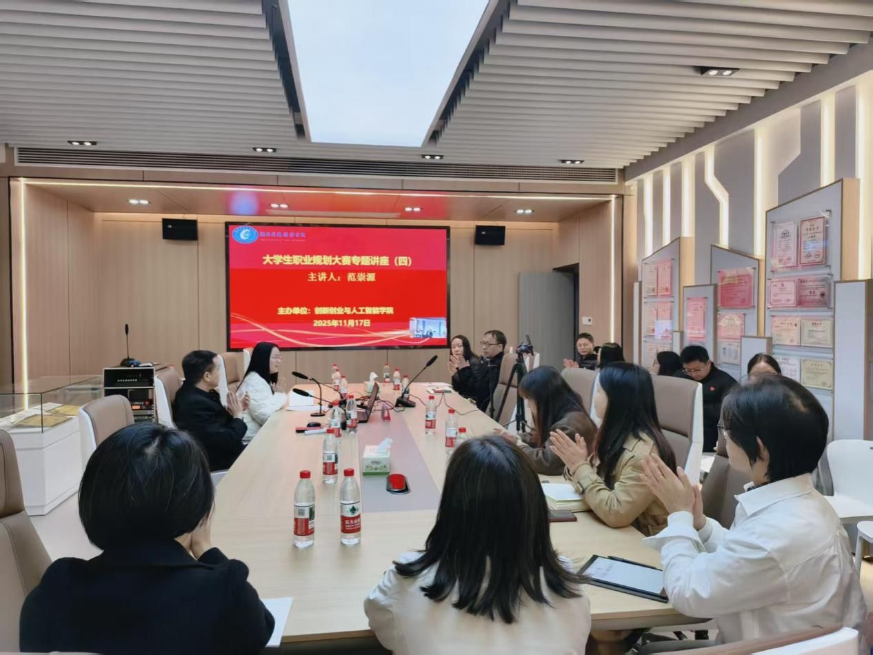 (本网讯)11月17日晚,为进一步提升我校大学生职业规划大赛的筹备质量与指导水平,创新创业与人工智能学院在主校区第一教学楼北栋101展厅,成功举办题为“全国职业规划大赛的筹办和指导学生的几点经验”专题讲座。本次讲座由学院副院长胡小梅主持,特邀全球职业规划师、教育部全国万名创新创业优秀导师计划专家范崇源主讲。各二级学院竞赛负责人及指导教师代表齐聚一堂,共话赛事育人新路径。