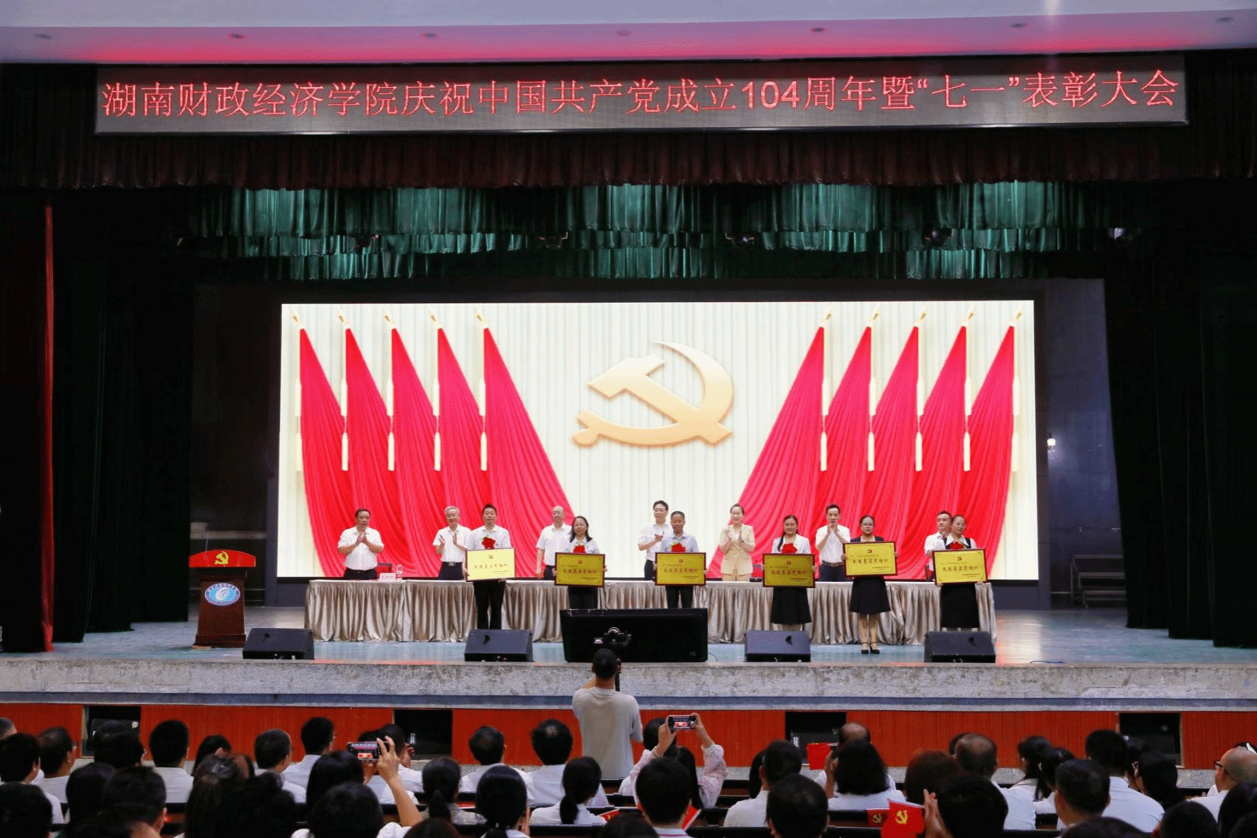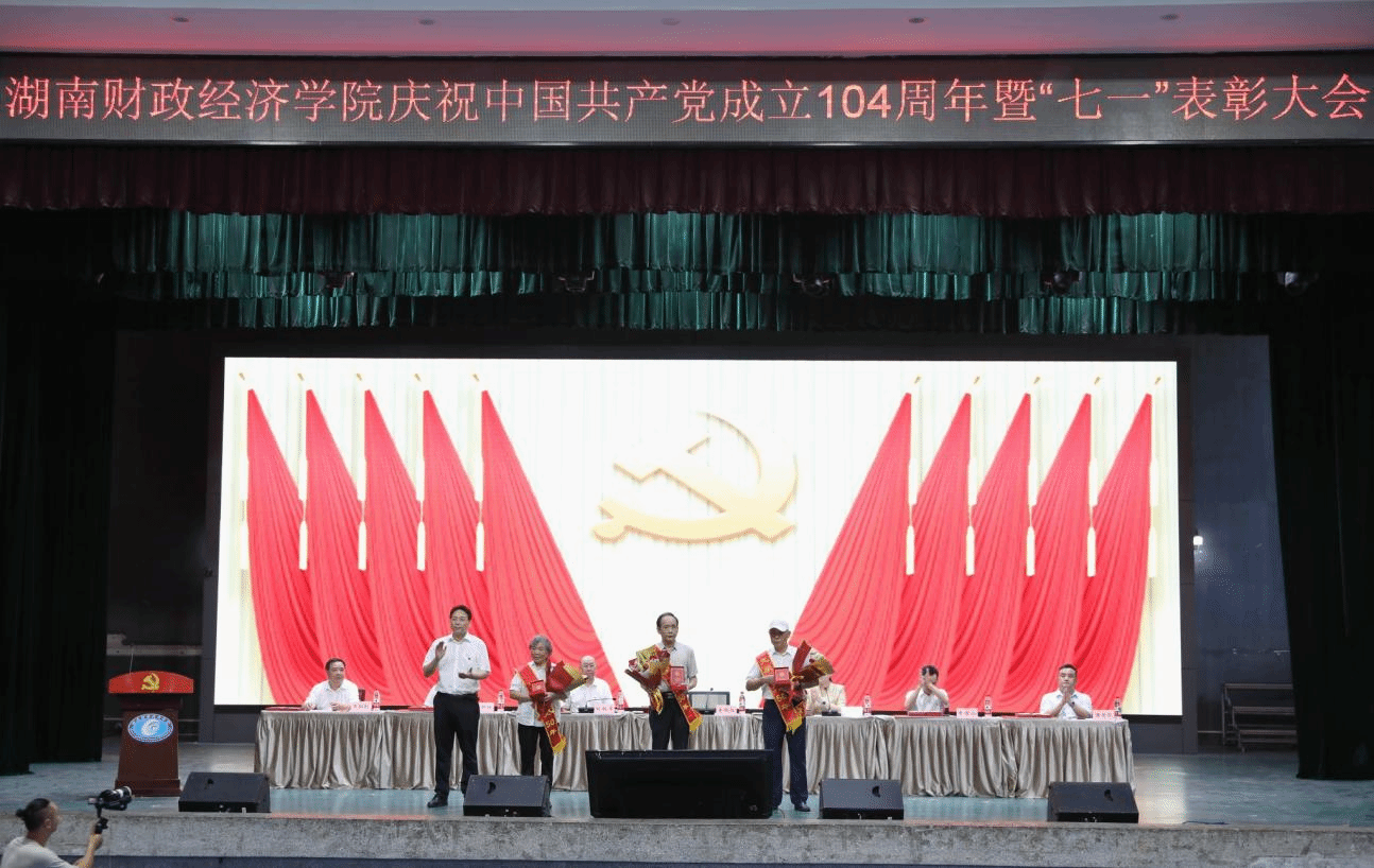 副校长赵鹤平宣读了表彰决定。学校领导为“光荣在党50年”老党员代表颁发纪念章;为我校获评湖南省高校党建工作“标杆院系”“样板支部”“党务工作示范岗”“青年教工党员示范岗”的先进集体和个人,以及学校41名优秀共产党员、8名优秀党务工作者、6个先进基层党组织代表颁发奖牌和荣誉证书。