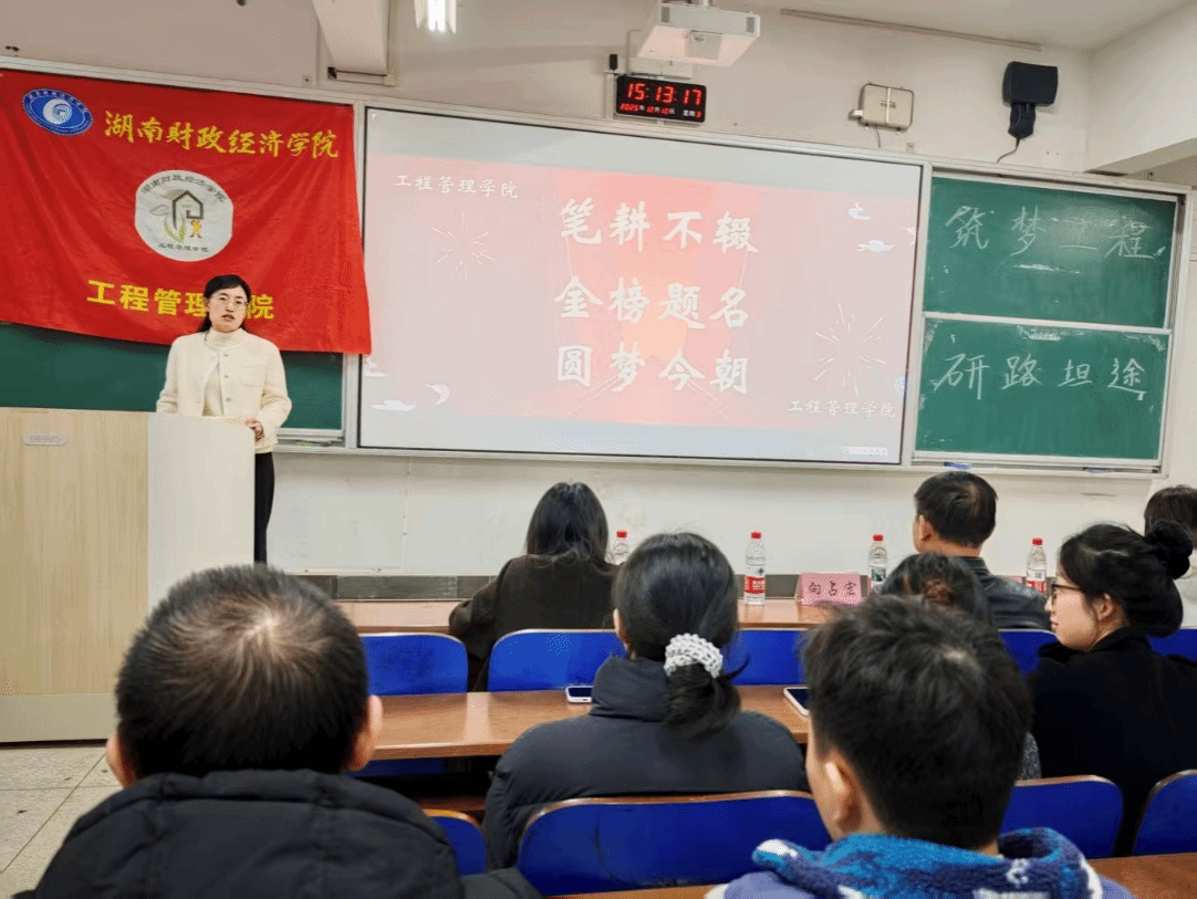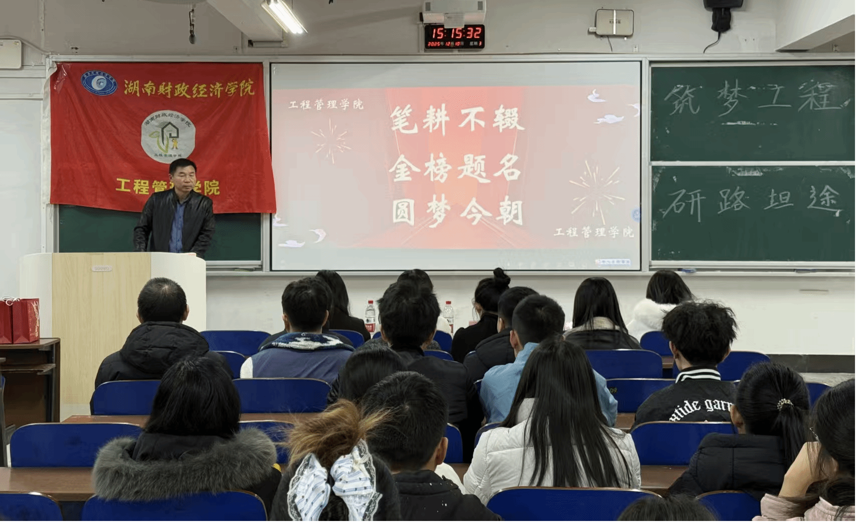 (本网讯)为切实关怀毕业生考公考研备考需求,缓解学子备考压力,12月10日下午三点,工程管理学院在3108 教室顺利开展考公考研温暖会。学院党委书记向占宏、党委副书记刘绿丝出席会议并发表讲话,学工办主任袁仕远,毕业班辅导员陈龙雨、徐湘婷一同参会,与学院毕业班备考学子共话备考、共暖人心。