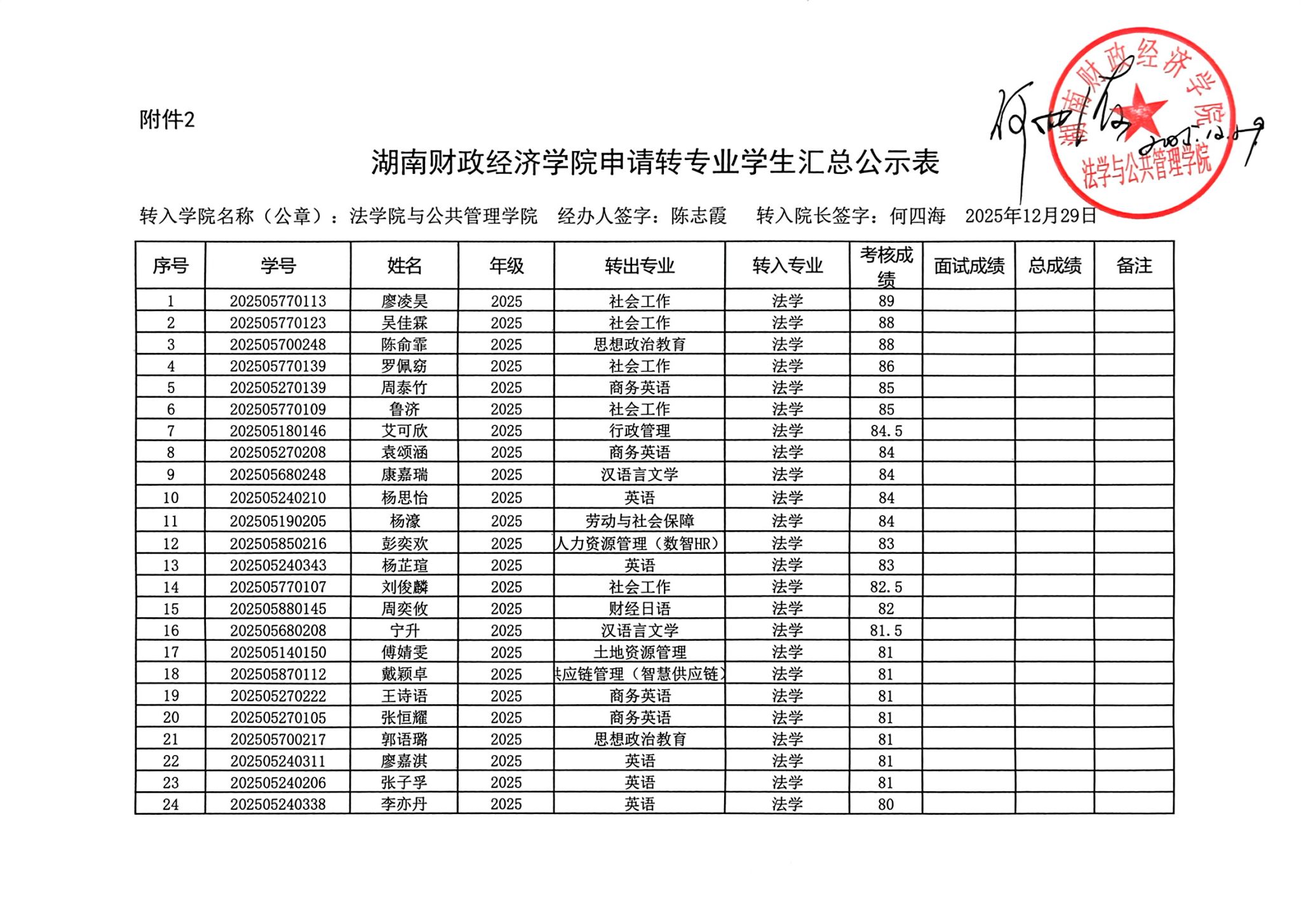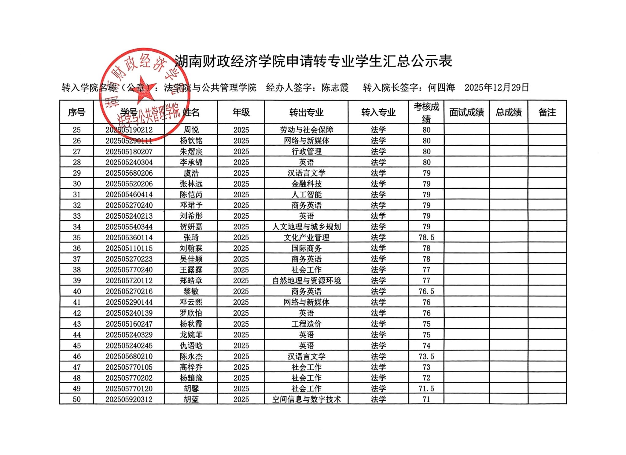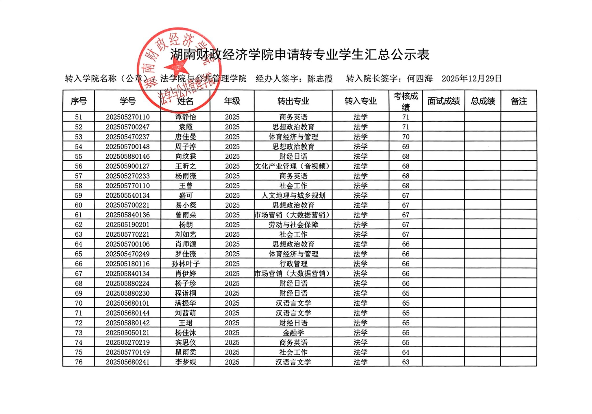 法学与公共管理学院2025级本科生转法学专业拟同意转入名单公示表