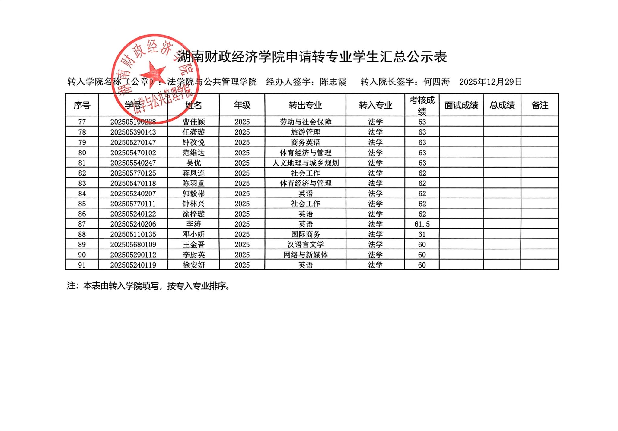湖南财政经济学院申请转专业学生汇总公示表(法学与公共管理学院)