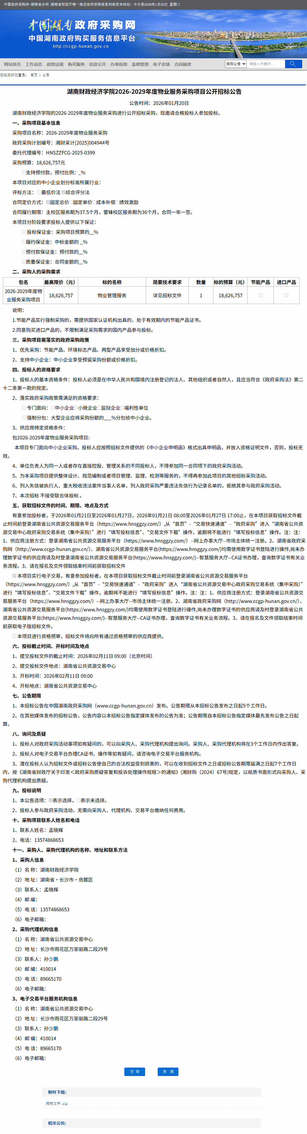 湖南省政府采购网:湖南财政经济学院2026-2029年度物业服务采购项目公开招标公告