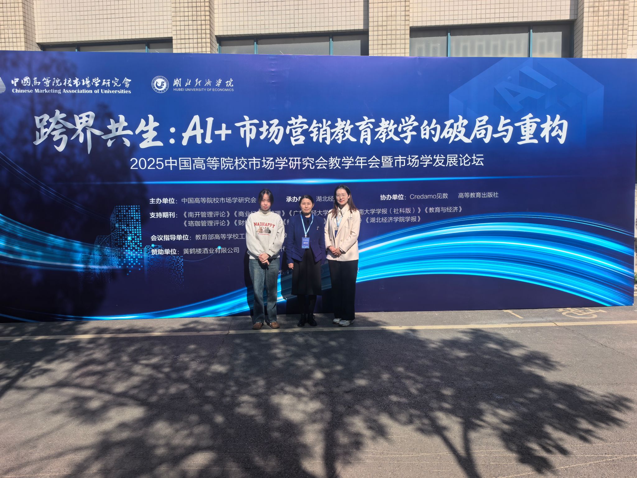 (本网讯)11月28日至30日,“跨界共生:AI+市场营销教育教学的破局与重构”2025中国高等院校市场学研究会教学年会暨市场学发展论坛在武汉举行。会议由中国高等院校市场学研究会主办、湖北经济学院承办,聚焦AI时代市场营销教育创新,吸引全国高校专家学者、行业从业者及师生代表参会,我校工商管理学院数智营销与电商系卢艳副教授与前系主任陈春燕老师,以及2022级市场营销专业学生张晴,共同应邀出席。