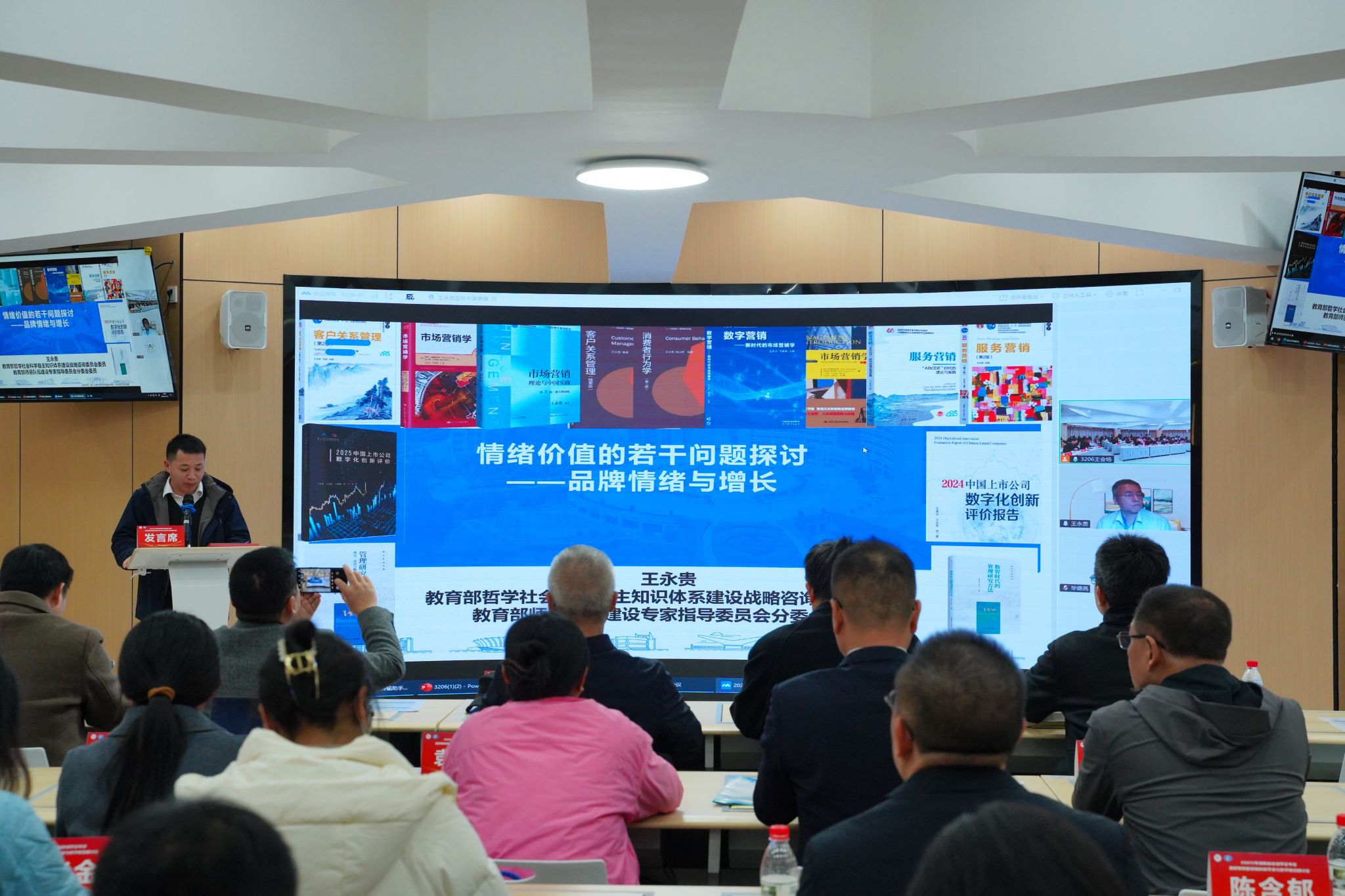 本次研讨会采取“主会场报告+平行分论坛”的多元化形式,构建了全方位、多层次的交流平台,精准对接学术研究与教学实践需求。主会场紧扣“数智赋能营销创新学术与教学教改”核心议题,特邀四位国内知名专家作专题报告。浙江工商大学校长、教授、博士生导师王永贵通过云端连线形式,围绕“情绪价值的若干问题探讨”解析数智时代消费者情绪需求的新特征与营销实践的适配方向;武汉大学数据科学研究中心主任、教授、博士生导师黄敏学以“数智场景商务:实践创新与理论前沿”为主题,分享数智技术驱动下营销场景的重构逻辑与创新案例;浙江财经大学科研处处长、教授、博士生导师王建明围绕“绿色低碳消费趋势(2025)洞察和解读”,深刻阐述绿色消费的政策导向、市场现状及企业营销的转型路径;江西财经大学科研处处长、教授、博士生导师谌飞龙围绕“科技成果转化与创业营销”,探讨技术商业化过程中的营销链路搭建与资源整合策略。