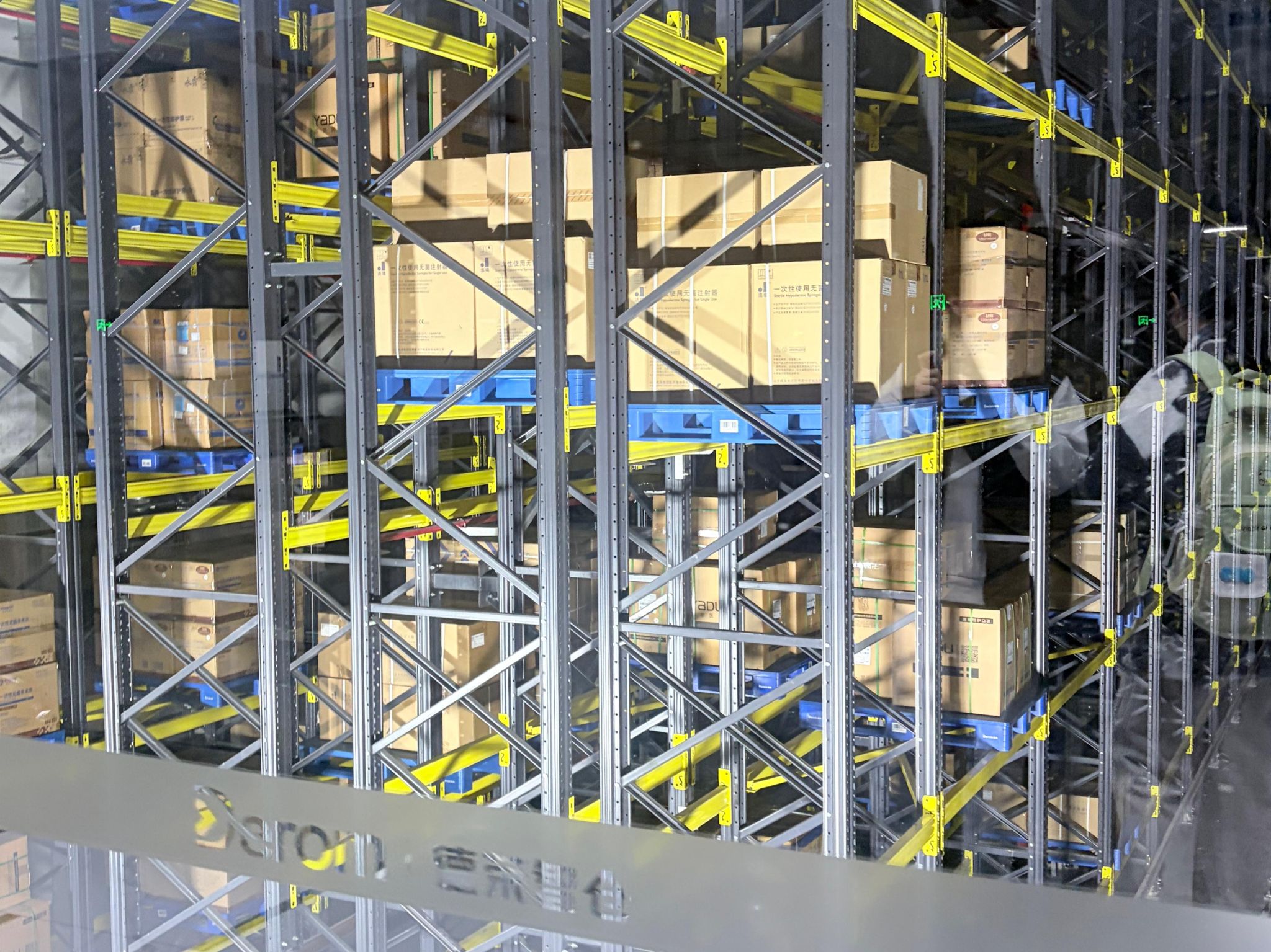透过透明的隔离屏障,金属货架纵横交错,形成规整的网格结构。蓝色的托盘整齐地摆放在货架上,上面堆放着大量棕色的纸箱,这些纸箱里装着各类医疗物资。自动化设备在轨道上有条不紊地运行,机械臂精准地抓取和放置货物,展现出高度的精确性和稳定性。