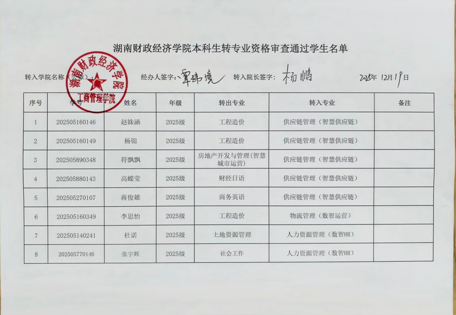 湖南财政经济学院本科生转专业资格审查通过学生名单公示