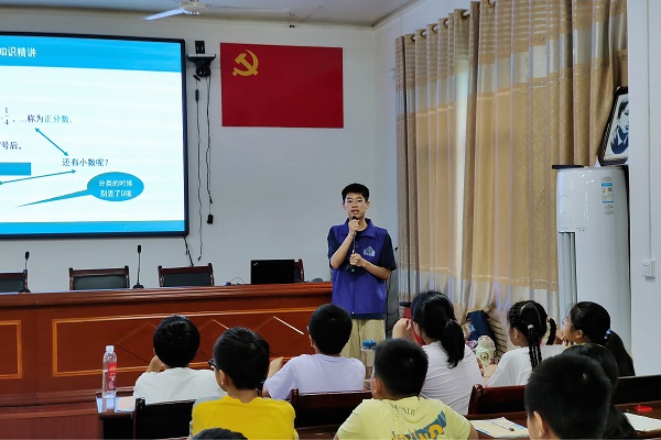 山水之间,绿野之中,藏着最美的夏。7月6日是远辰志愿服务队在龙塘湾村进行社会实践活动的第二天。伴随着盛夏的风,志愿者们满怀激情地迎接新的一天。 支教组 “数学是人类智慧皇冠上最灿烂的明珠”,7月6日上午,支教组颜福伟带领小朋友开展了一堂别开生面的数学课。 考虑到不同年龄段小朋友的学习进度,颜福伟将班级分为中年级和高年级两个大组。针对高年级学生,他讲解了有理数、数轴的概念、相反数的运算等知识点,并引导学生完成课后练习。 颜福伟讲解有理数知识点 刘祎梦摄 针对中年级学生,颜福伟带领他们复习了乘法以及1000以内的加减法混合运算,课程以例题讲解为主,以练促学,温故而知新。 课堂上,同学们思维活跃,积极主动,课堂学习氛围高涨;下课后,颜福伟为同学们批改作业,上午的教学活动顺利结束。 颜福伟为学生批改作业 刘祎梦摄 实践组 为了营造乡村艺术气息,提升学生们的动手能力和创造能力,下午在教室我们开展了一系列的艺术活动。 首先,老师带学生们练习了《歌唱祖国》这首歌曲。在一声声歌唱中,学生们的激情和热情都融入到爱国之情当中。 老师带学生们唱歌 叶锋摄 接下来,由老师们带领学生参与“树叶画”活动,学生们思维大开,给树叶做出了很多丰富独特的造型。 老师带学生们展示作品 叶锋摄 最后一堂课是交通安全课,老师以ppt和情景结合的形式生动地教育学生们不要横穿马路以及不注意交通安全会带来的严重后果,相信学生们会更加树立交通安全意识。 老师上交通安全课 唐春月摄 直播组 宣扬红色文化,传承昆弟精神。为响应村委的号召,直播组对龙塘湾宣传短视频拍摄前期进行了充分的准备并展开了激烈的讨论。 此次准备工作确定了视频拍摄的三大主体部分,分别是政治、经济、文化。主要宣传形式以采访类风格呈现,借助旁白渲染视频宏观的气势。并且邀请了村委党建专干谢定乾主任来为我们指导拍摄工作以及出席视频拍摄为我们讲解龙塘湾村特有的党建红与产业绿。 直播组讨论脚本制作与拍摄场景选择 钟慧灵摄 谢定乾主任讲解脚本部分相关疑惑 钟慧灵摄 习总书记曾向青年寄语:“奋斗是青春最亮丽的底色,行动是青年最有效的磨砺。有责任有担当,青春才会闪光。”海阔凭鱼跃,天高任鸟飞。在接下来的日子里,志愿者们将继续奋斗前行。
