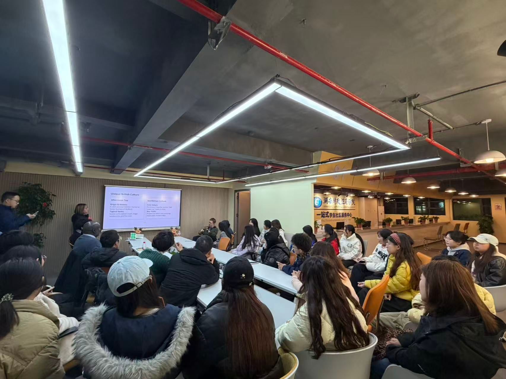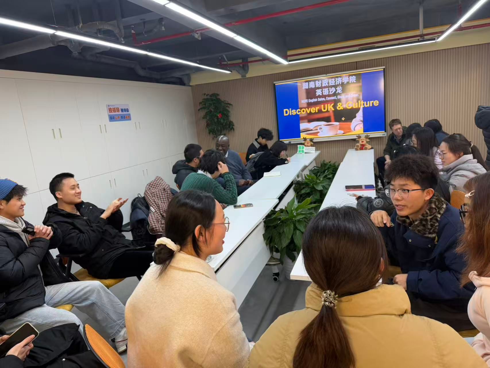 活动特邀英国罗汉普顿大学Simon教授、Robert教授亲临现场,与同学们围绕英国文化展开深度交流与趣味探讨。两位教授结合自身经历,生动讲解英国风土人情、社会文化与生活习俗,同学们积极互动提问、大胆开口交流,在轻松愉悦的氛围中感受英语语言魅力,领略异域文化风采。现场交流氛围浓厚,掌声与笑声不断,大家不仅提升了英语口语表达能力,更结识了来自不同学院的伙伴,有效促进了跨学院学子间的沟通与友谊。