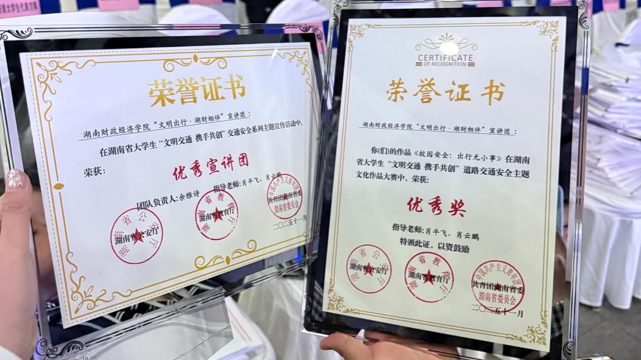 近日,在湖南省公安厅、省教育厅、团省委联合主办的“文明交通 携手共创”湖南省大学生道路交通安全主题系列活动中,湖南财政经济学院厚生国际教育学院“文明出行·湖财相伴”宣讲团凭借扎实的实践成果与优质的作品创作,荣获两项省级荣誉——团队获评“优秀宣讲团”,其报送的短视频作品《校园安全:出行无小事》获评“主题文化作品大赛优秀奖”。