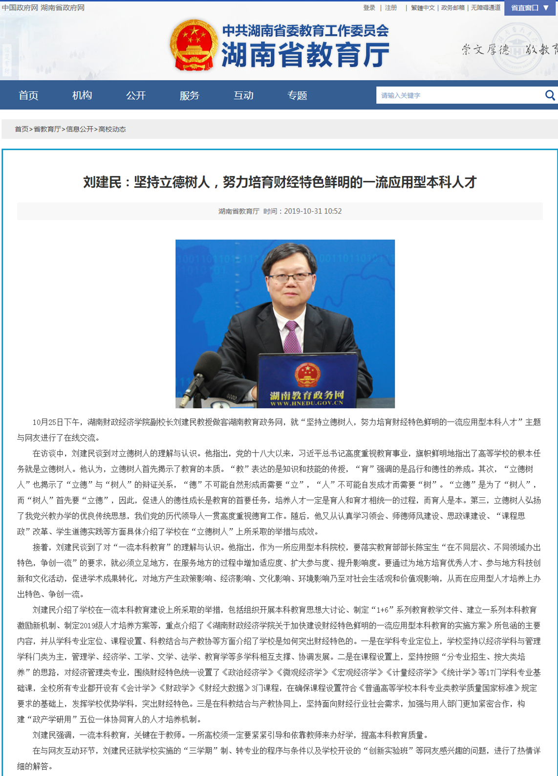 湖南日报·新湖南客户端10月31日讯(通讯员 刘征 )10月25日下午,湖南财院副校长刘建民做客湖南教育政务网,就“坚持立德树人,努力培育财经特色鲜明的一流应用型本科人才”主题与网友进行了在线交流。副...