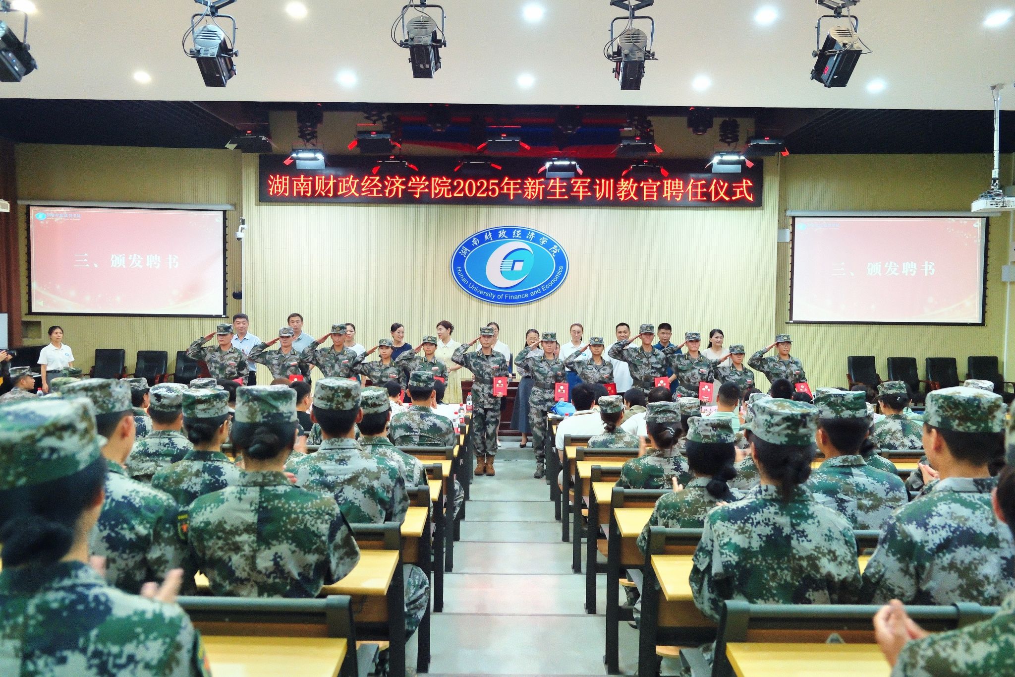 (本网讯)9月8日下午,我校在2J03学术报告厅举行2025级新生军训教官聘任仪式。校党委副书记苏玲出席并讲话。学生工作部、武装部负责人,各二级学院学工负责人,全体2025级新生辅导员和军训教官参加活动。聘任仪式现场 邓柳/摄仪式在全体人员齐唱国歌声中拉开序幕。学生工作部部长欧阳海峰宣读2025级新生军训教官聘任文件,来自各二级学院的90名在校生被正式聘任为军训教官,其中包括10名退役复学学生。各二级学院学工负责人为受聘教官颁发了聘书。...
