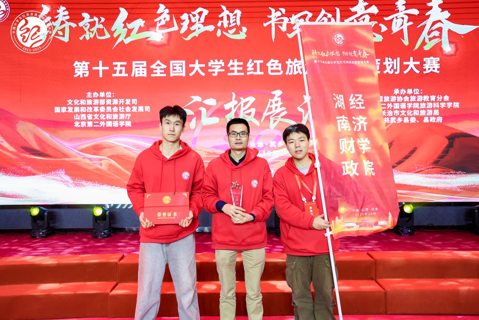 (本网讯)10月21日,第十五届全国大学生红色旅游创意策划大赛全国总决赛结果揭晓,我校人文与艺术学院“绘先锋”团队创作的红色故事微漫画作品《心向党辉,终化明灯》荣获全国二等奖。参赛师生合影我校代表(左二)上台领奖本届大赛由文化和旅游部资源开发司、国家发展和改革委员会社会发展司、山西省文化和旅游厅、北京第二外国语学院等单位共同主办,共吸引全国1001所高校的6002支团队、逾3万名师生参与。我校自2019年起连续五年组织参赛,...