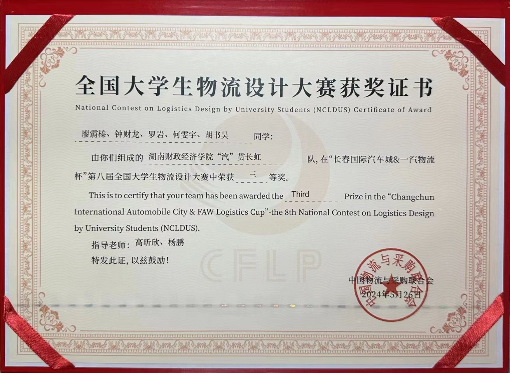 我校参赛团队“汽”贯长虹,由2022级物流管理专业的廖霨榛(队长)、何雯宇、胡书昊,2021级物流管理专业的钟财龙和2022级数据科学与大数据技术专业的罗岩5位同学组成,在工商管理学院高昕欣、杨鹏两位老师指导下,参赛作品《新质生产力赋能长春一汽物流园区高质量发展方案设计》荣获全国三等奖,5位同学获得《物流职业能力等级证书(中级)》。