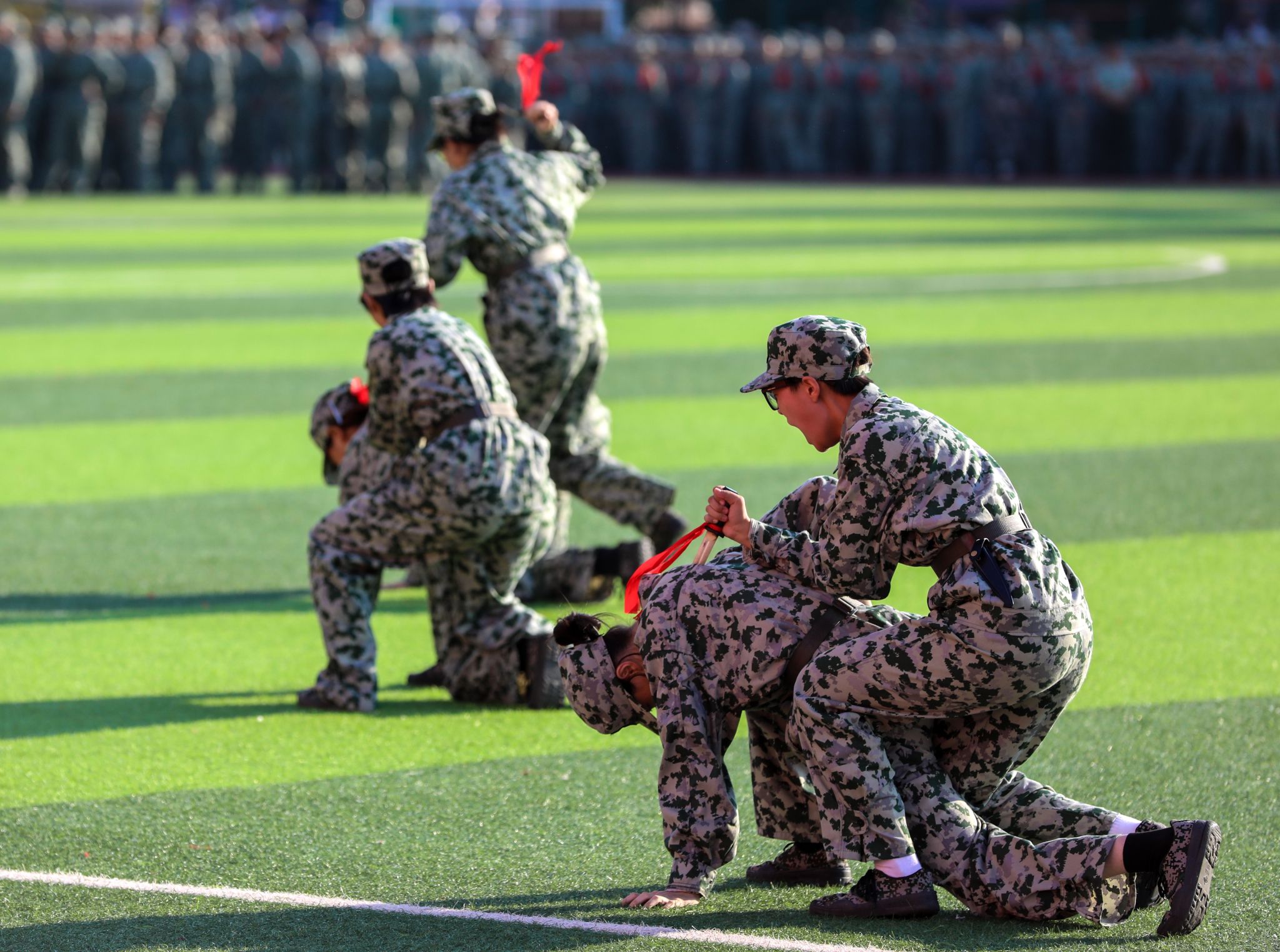 在军训汇报表演中,擒敌拳方阵动作刚强有力,气势磅礴;匕首操方阵、刺杀操方阵在烟雾弹模拟的硝烟弥漫战场,“杀”声嘹亮、攻势犀利,尽显坚韧不拔、勇敢顽强的战斗作风;由2000余名学生组成的文化方阵表演让现场沸腾,他们凭借队列变化,摆出“75”“繁荣昌盛”“幸福安康”“中国地图”等造型为新中国成立75周年送上深情祝福,变换“HUFE 1933-2024”“正德厚生 经世济用”等字样传递他们的爱校情怀。