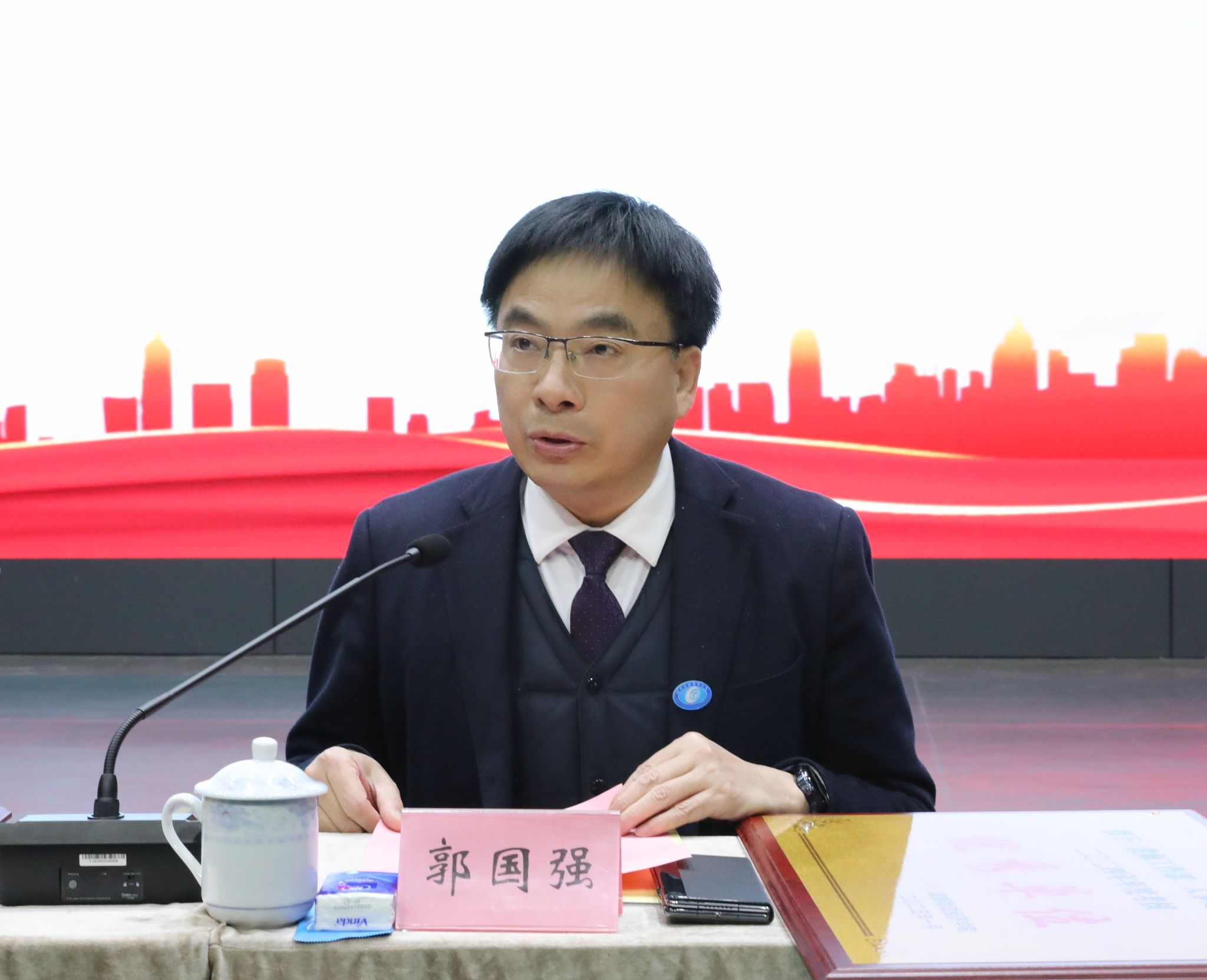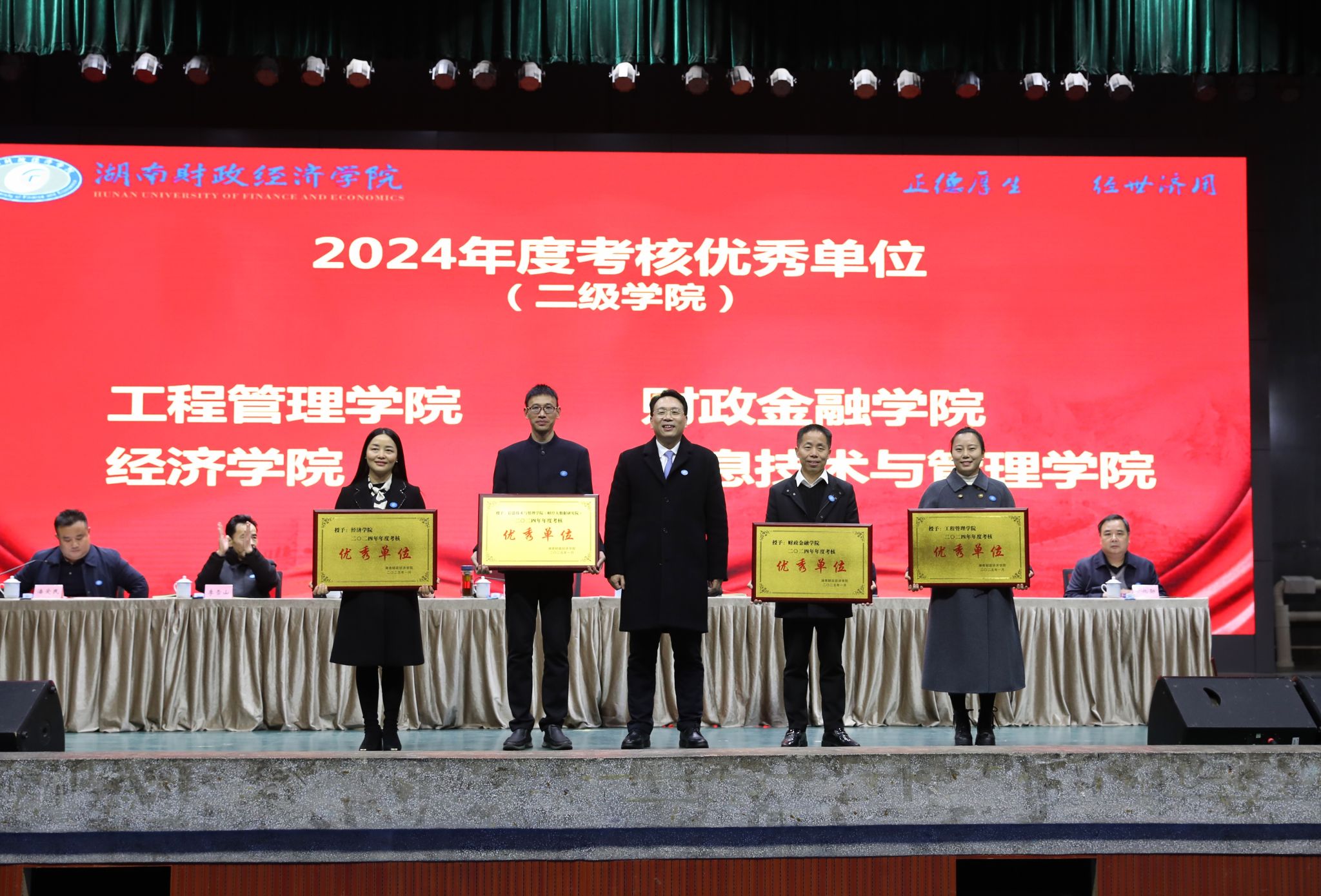 副校长郭国强宣读了学校2024年度考核优秀单位名单,全体校领导为获奖单位颁奖。