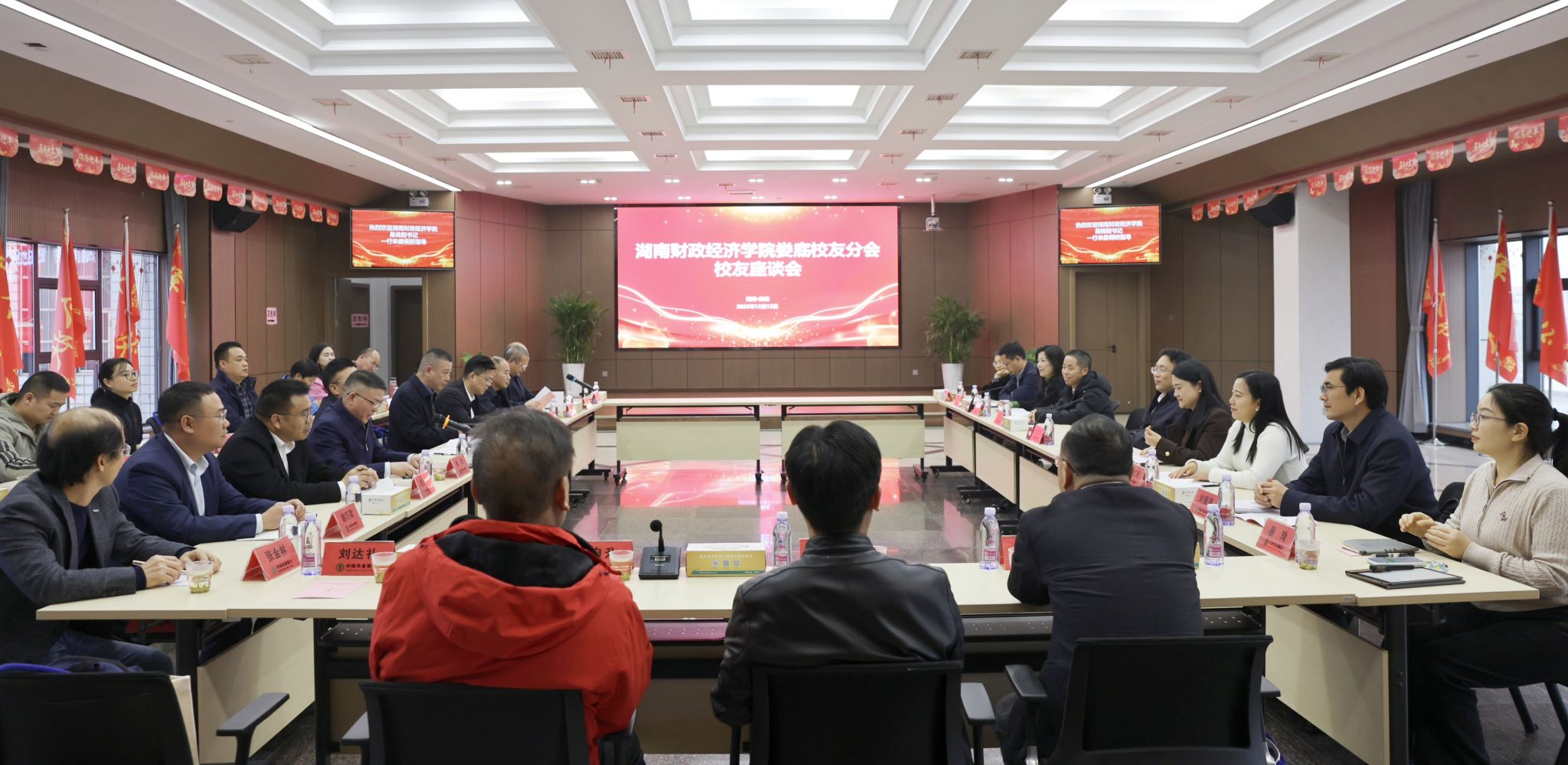 在校友座谈会上,我校1992级校友、娄底市人民政府驻北京联络处主任李雄峰代表娄底校友致欢迎辞。他深情回顾在母校的求学时光,感恩“正德厚生 经世济用”的校训滋养,表示将凝聚娄底校友力量,推动校企合作,服务地方实体经济。1990级校友、渤海财产保险股份有限公司娄底中心支公司党总支书记唐友开介绍了娄底校友工作开展情况,表示将进一步加强组织建设、丰富活动形式,搭建校企对接平台,持续深化校地校企协同,助力实体经济发展。1992级校友、娄底市农业银行行长李晖在主持时表示,将不负母校栽培,砥砺前行,为地方金融事业发展与实体经济繁荣贡献力量。