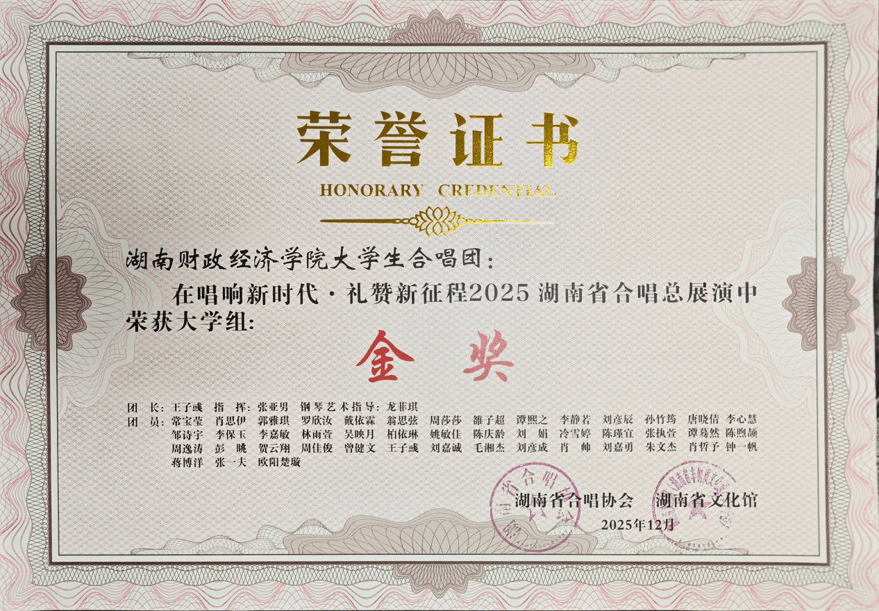 (本网讯)12月28日,在“唱响新时代·礼赞新征程”2025湖南省合唱总展演中,我校大学生合唱团作为大学生组唯一非专业团队凭借精湛演绎斩获该组别金奖。人文与艺术学院教师张亚男荣获“最佳指挥奖”,会计学院学生龙菲琪荣获“最佳伴奏奖”。