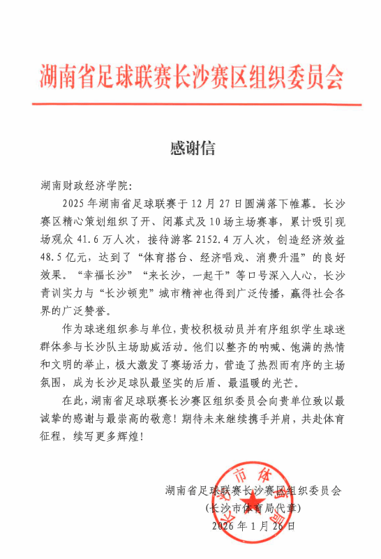 (本网讯)1月26日,我校收到湖南省足球联赛长沙赛区组织委员会发来的感谢信,信中对我校在2025年湖南省足球联赛期间积极组织学生球迷参与赛事助威工作表示诚挚感谢与崇高敬意。