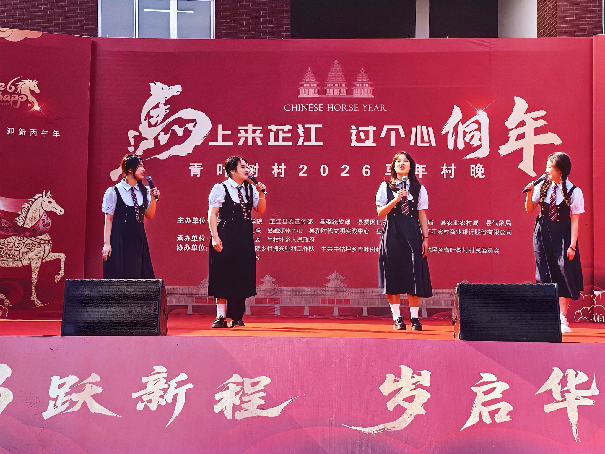 随着音乐响起,备受期待的百姓“村”晚将气氛推向高潮。村民自编自演的侗歌《侗歌向着北京唱》、广场舞《青叶逐兴》、传统“闹年锣”的管弦乐《美丽的鲜花在开放》等轮番登场。我校师生带来的合唱《走在乡间的小路上》和民乐演奏《赛马+步步高》,为山村舞台注入了青春活力。演出间隙的知识抢答、成语接龙等互动环节持续点燃现场热情,活动中还对“新型农民”“好媳妇”“最美公益奉献者”等先进典型进行表彰,让文明乡风在掌声中传递。