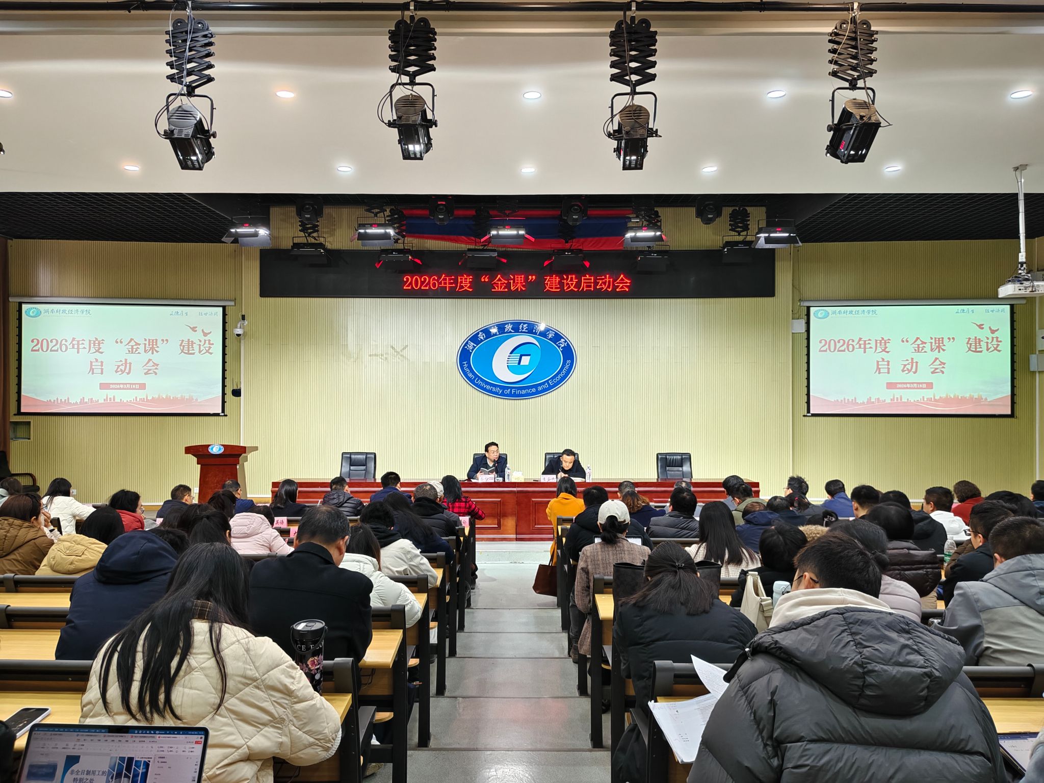 (本网讯)3月18日,我校在2J03学术报告厅召开2026年度“金课”建设启动会。校党委书记易棉阳出席会议并讲话,副校长潘爱民主持会议。教务处、教学质量监控与评估中心、各二级学院相关负责人及“金课”团队成员参加会议。