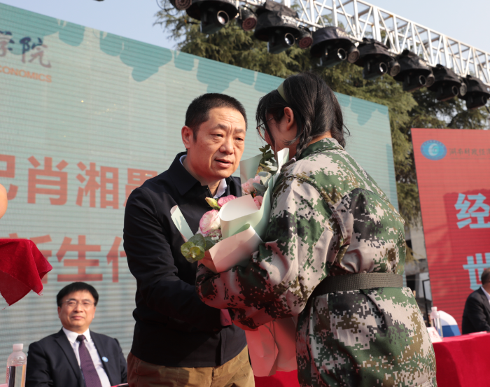党委书记肖湘愚向新生代表授予校徽并赠送鲜花 何妍/摄