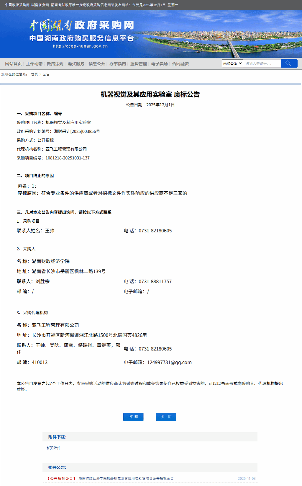 湖南省政府采购网:湖南财政经济学院机器视觉及其应用实验室废标公告