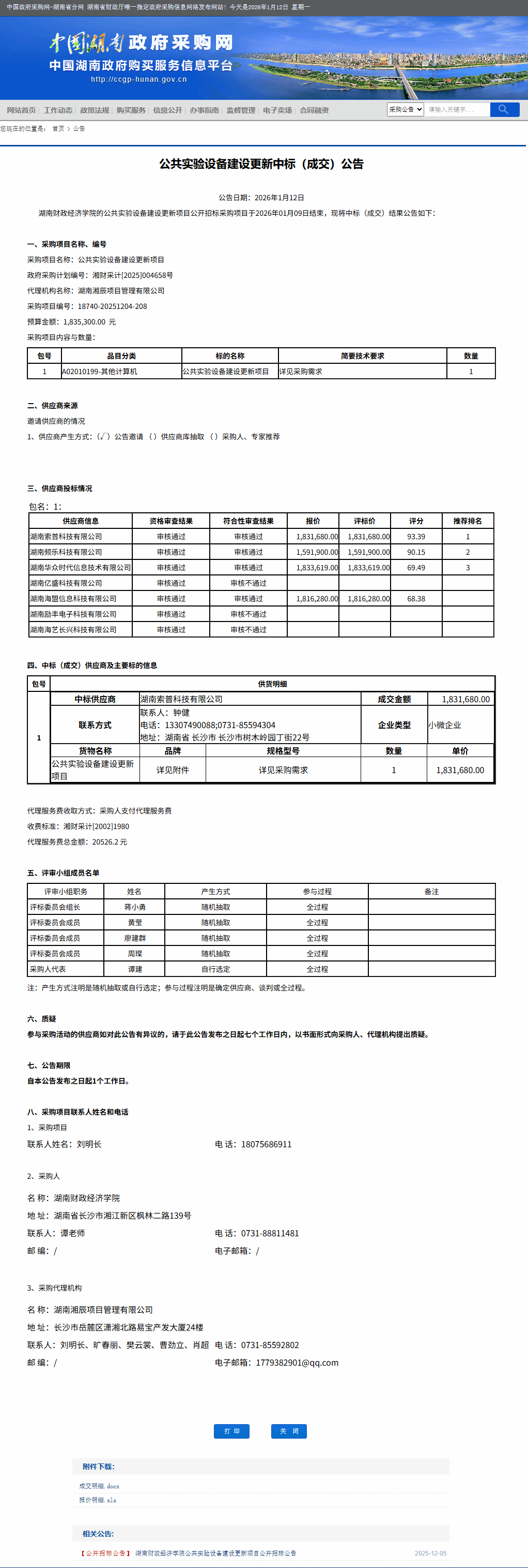 湖南省政府采购网:湖南财政经济学院公共实验设备建设更新中标(成交)公告