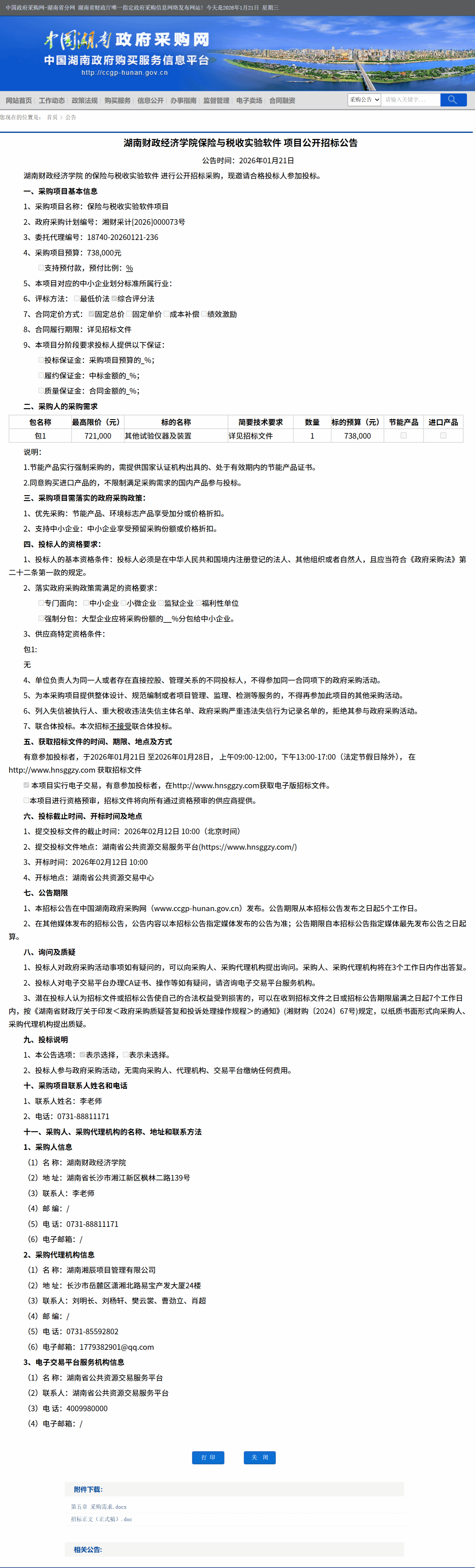 湖南省政府采购网:湖南财政经济学院保险与税收实验软件项目公开招标公告