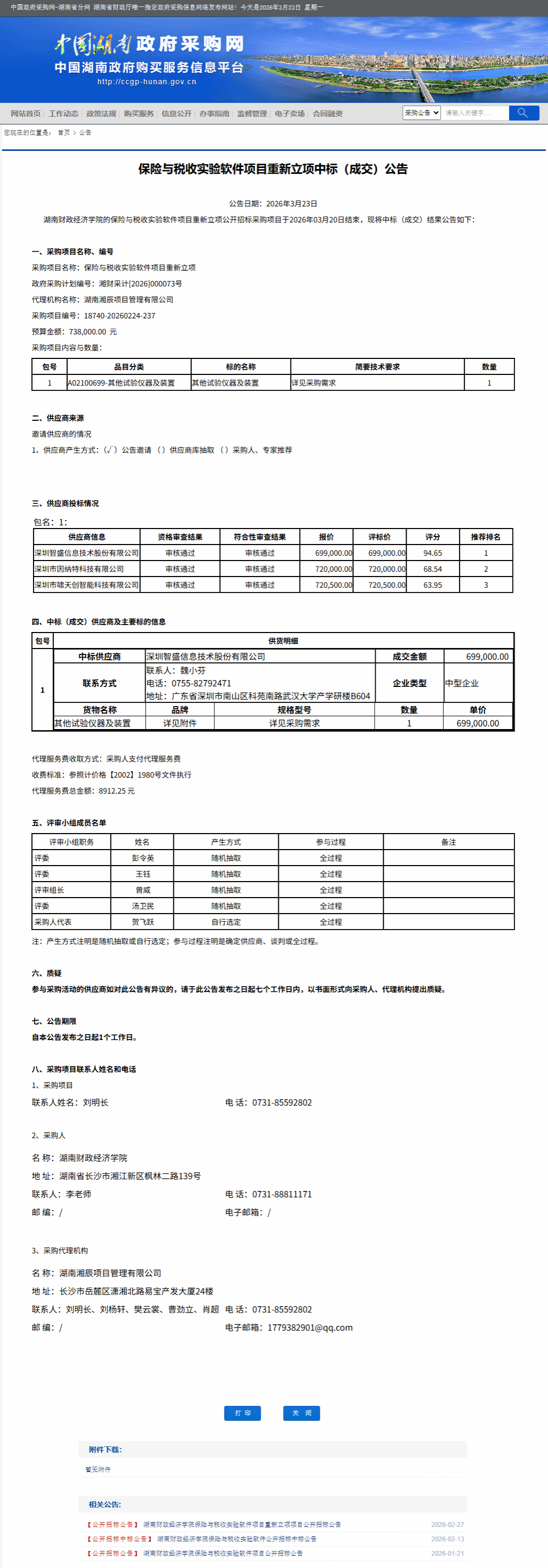 湖南省政府采购网:保险与税收实验软件项目重新立项中标(成交)公告