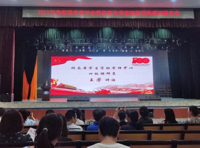 新湖南客户端5月24日讯(通讯员 赵恺 张子玲 摄影:孔令宇)5月14日下午,“红心向党·感恩资助”2021年湖南省高校奖学金获得者优秀事迹巡回报告会在湖南财政经济学院大礼堂举行。湖南省学生资助管理中心四级调研员王芳、湖南财政经济学院副校长苏玲出席并致辞。报告会由湖南财政经济学院学生工作处处长杨锴主持。