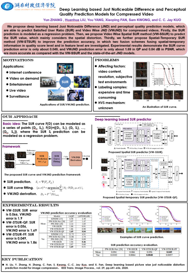 新湖南客户端5月13日讯(通讯员 刘胜宗 供图 :刘焕华)近日,由湖南财政经济学院信息技术与管理学院樊晓平教授团队与中国科学院深圳先进技术研究院、华中科技大学、香港城市大学及美国南加州大学合作完成的人工智能视频处理领域创新性研究成果“Deep Learning Based Just Noticeable Difference and Perceptual Quality Prediction Models for Compressed Video”被国际权威期刊IEEE TCSVT在线发表。湖南财政经济学院刘焕华博士为共同通讯作者。