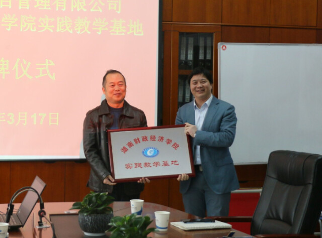 湖南财政经济学院副校长刘茂盛(左)为湖南新星项目管理有限公司授牌