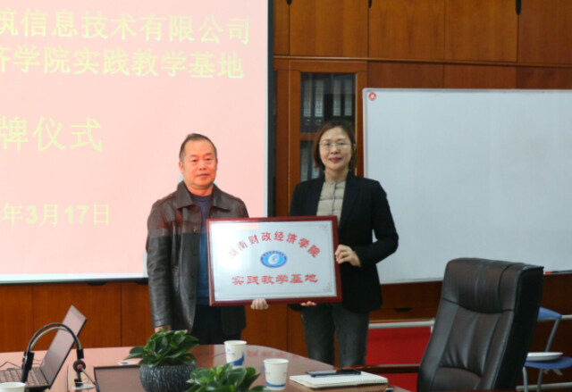 湖南财政经济学院副校长刘茂盛(左)为湖南亭台阁建筑信息技术有限公司授牌