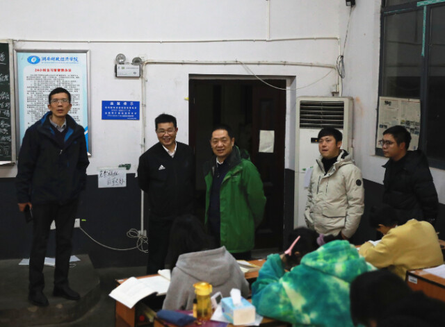 新湖南客户端12月16日讯(通讯员 孙波 宋佳文 摄影:唐南林)12月9日晚,湖南财政经济学院党委书记肖湘愚,校长刘长庚,党委委员、宣传统战部部长陈灿军深入学校各自习场所,视察自习场所使用和管理情况。湖南财政经济学院图书馆馆长刘纳新、学生工作处处长杨锴等陪同。
