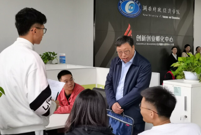新湖南客户端10月21日讯(通讯员 李民栋 李克跃 摄影:柏馨芸 赵嘉欣 綦灵芝)10月16日,以湖南国防工业职院院长杨可以为组长的湖南省高校大学生创新创业孵化示范基地评审专家组一行5人来到湖南财政经济学院,进行为期一天的实地考察评审。考察评审内容包括听取学校负责人汇报、查看资料、察看现场、召开座谈会、专家合议形成初步意见和反馈意见等环节。湖南财政经济学院党委书记肖湘愚,校长刘长庚,副校长刘建民、刘茂盛,党政办、教务处、人事处、财务处、招生就业处、学生工作处、校团委主要负责人及二级学院院长参加了汇报会、反馈会及其他考察活动。