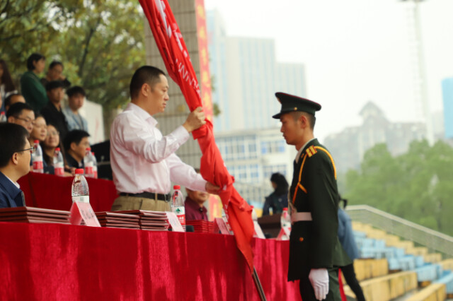 湖南财政经济学院党委书记肖湘愚向军训团授旗 颜润琦/摄