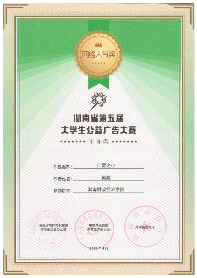 湖南日报·新湖南客户端7月2日讯(通讯员 周雅)6月27日,湖南省第五届大学生公益广告大赛颁奖典礼在湖南大众传媒职业技术学院举行,湖南财院荣获大赛“优秀组织奖”,由徐晶老师指导人文与艺术学院2017级网络与新媒体一班吴越同学创作的《仁爱之心》荣获平面类网络人气奖。