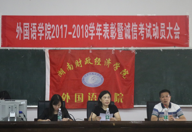 外国语学院于6月25日下午在2J01召开2017-2018学年表彰暨诚信考试动员大会。外国语学院党总支书记李建梅、副书记郭志伟和全体辅导员出席本次会议,学工办副主任肖叶枝主持会议,外国语学院全体学生参加会议。