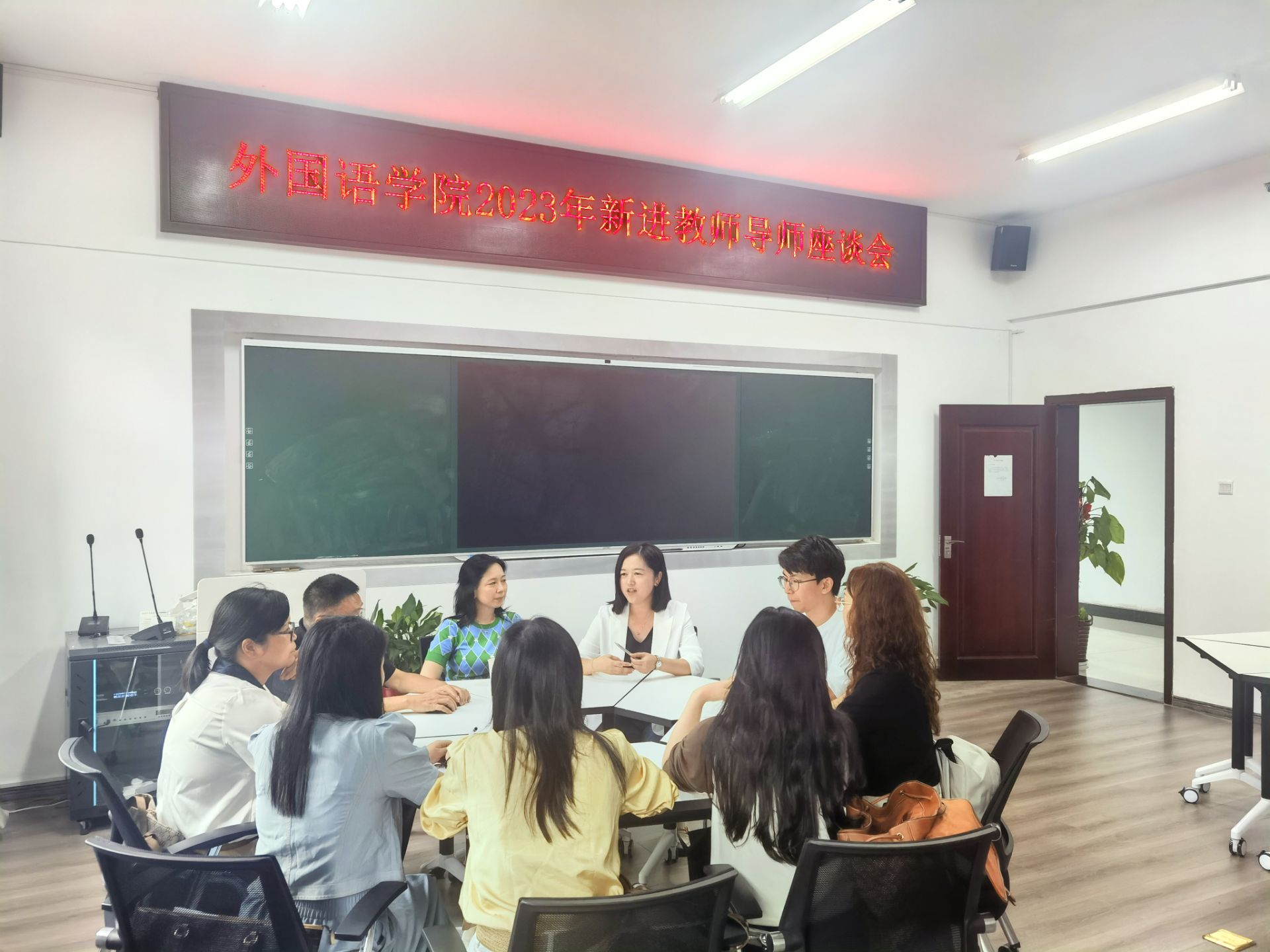 (本网讯)为帮助新进教师更好地适应教育教学环境,9月14日,外国语学院在主校区办公楼317室召开2023年新进教师座谈会。院党委书记蒋勇威,副院长李曦,青年教师导师胡立、付敏以及2023年新进教师参加会议。