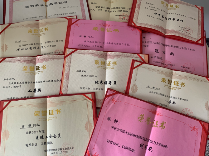 工作期间,陈静取得了许多成绩:学校第六届、第七届辅导员技能大赛一等奖,学校第五届网络思政案例大赛二等奖;2016年度、2019年度学校“军训优秀指导员”,2017年度学校优秀辅导员,2017年学校心理健康工作先进个人,2017年度学校工会先进个人,2017-2019年度学校优秀共产党员,2018-2019年度学校优秀教师,2019年度学校优秀易班指导老师。