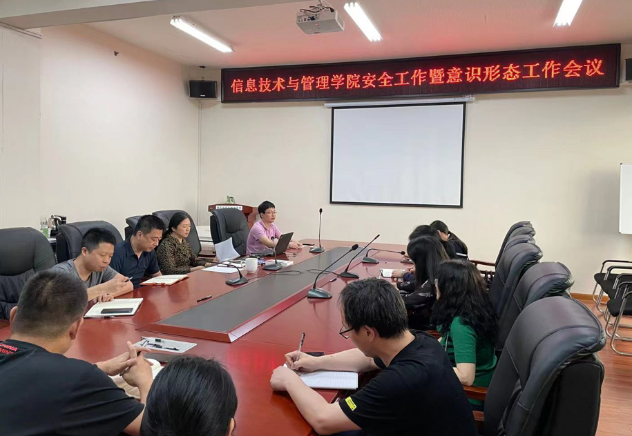 (本网讯)5月12日下午,信息技术与管理学院在办公楼315会议室召开2021年度安全稳定工作暨意识形态工作会议。学院全体领导班子成员,各办公室、各系主任及全体辅导员参加会议。会议由学院党总支书记曹松林主持。