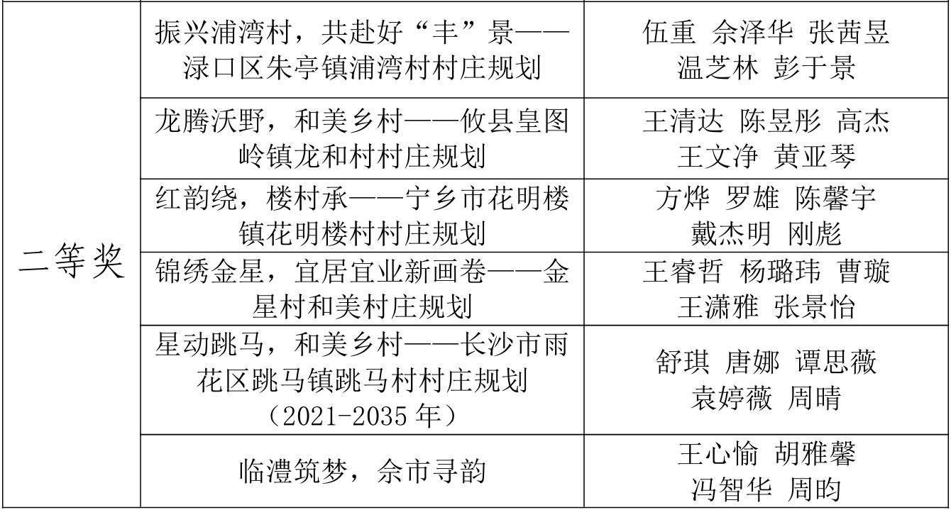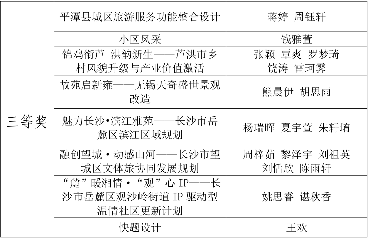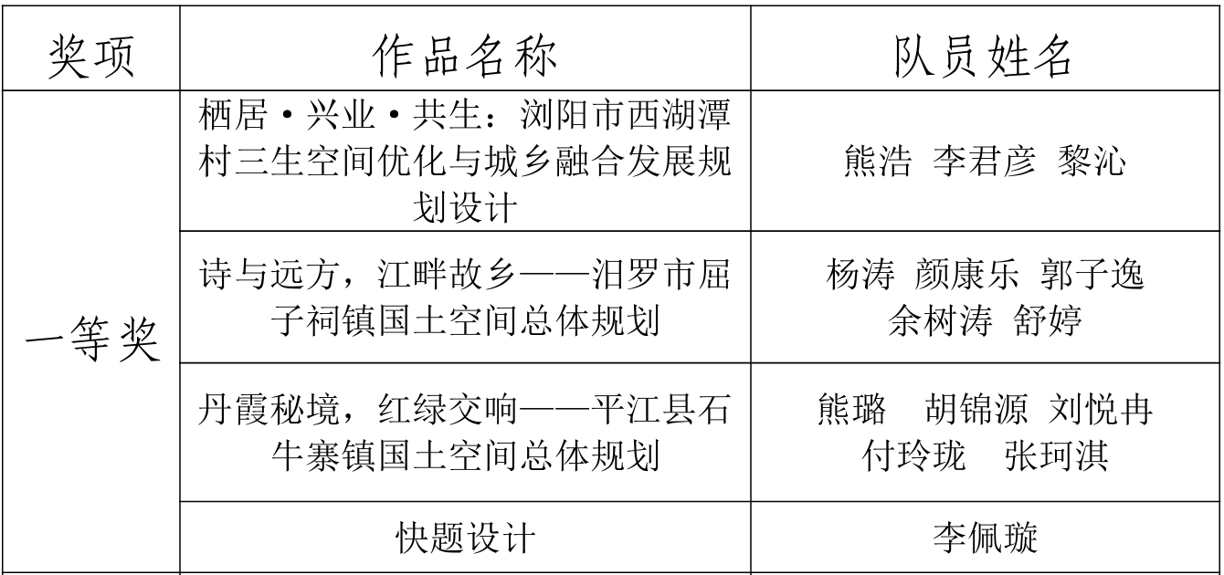 评审阶段,组委会邀请专业教师组成评审团,从“设计创新性、逻辑完整性、技术规范性、实践价值”四大维度对参赛作品进行综合打分,严格排查学术不端风险,确保赛事公平公正。最终在快题设计与设计作品两组别中共评选出一等奖4个,二等奖6个,三等奖8个,并拟推荐本次赛事的一、二等奖共10支队伍参加湖南省省赛。(具体获奖名单见下表)