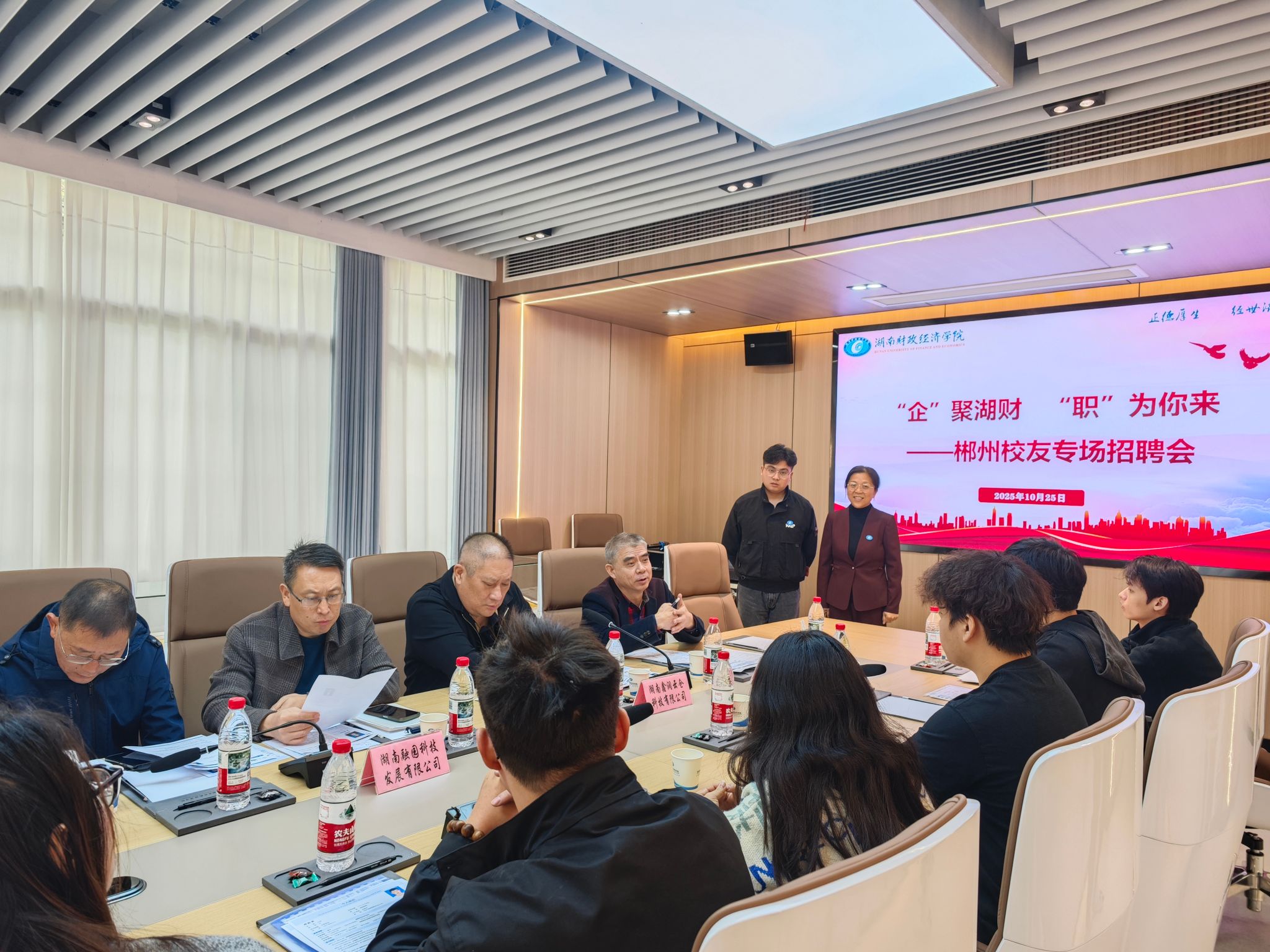 (本网讯)10月25日上午11点,经济地理学院郴州校友专场招聘会在主校区一教北栋101会议室顺利举办。本次招聘会为毕业生打通了“家门口”的就业通道,定向搭建校企人才对接桥梁,吸引我院30余名应届毕业生到场求职。招聘现场交流氛围热烈,毕业生积极与校友企业洽谈,展现出高涨的求职热情与专业素养。