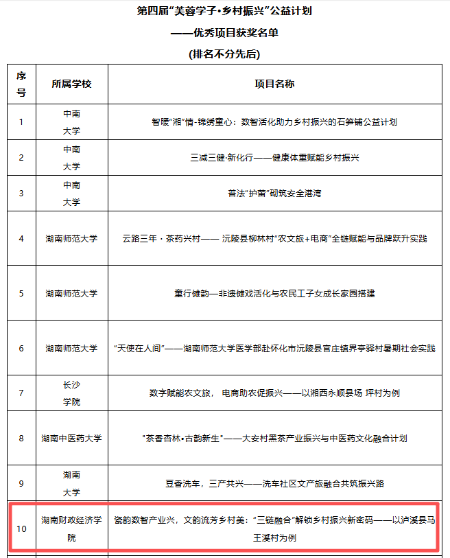 (本网讯)第四届“芙蓉学子・乡村振兴”公益计划优秀项目结项评审工作近日圆满落幕。经实施地反馈、专家评审、宣传加分、合规核查等多环节严格筛选,围绕创新性、可行性、示范性等核心维度综合考量,最终从60个参与答辩的项目中优中选优,20个优秀项目脱颖而出。其中,我校经济地理学院“经天纬地”筑梦团申报的《瓷韵数智产业兴,文韵流芳乡村美:“三链融合”解锁乡村振兴新密码——以泸溪县马王溪村为例》项目表现亮眼,成功斩获“优秀项目”,以青春之力深耕实践,为乡村振兴注入了蓬勃鲜活的动能。