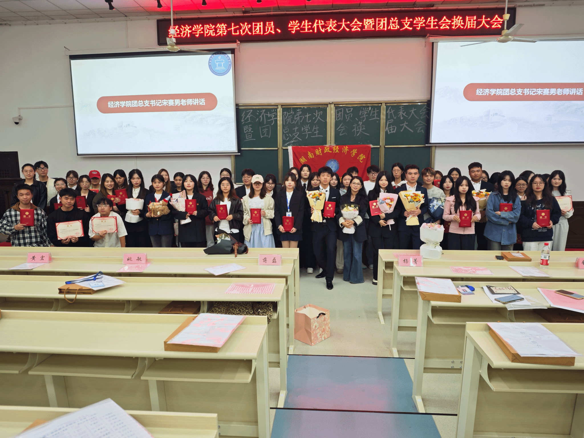 (本网讯)9月23日,经济学院团总支学生会(以下简称“团学会”)在2J01教室召开了第七次团员、学生代表大会暨团总支学生会换届大会。经济学院党委副书记刘英、副院长陈雯、学工负责人兼学生支部书记谢龙、团总支书记宋赛男、学生支部书记欧璐、辅导员王竹青、各院嘉宾、经济学院学生代表和全体团学会成员出席了此次会议,大会由学生会秘书长邱香炎主持。