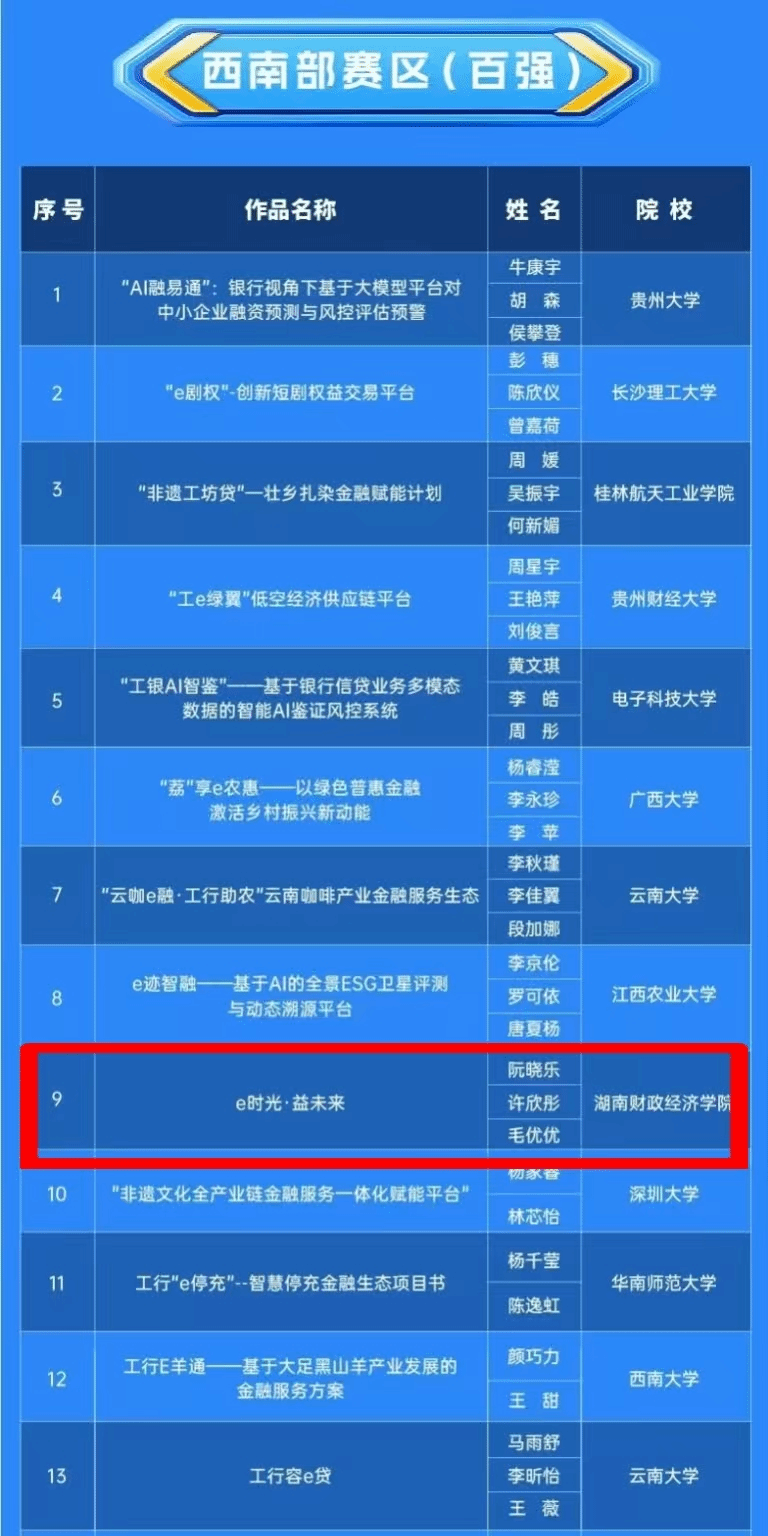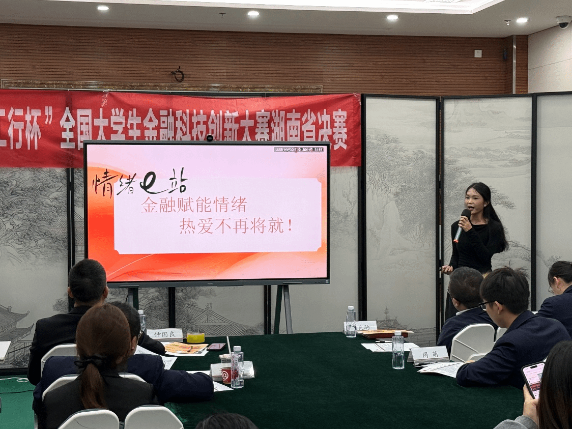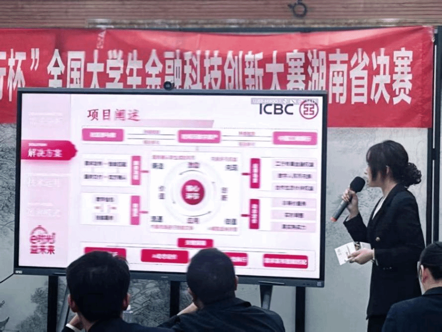 杨俊和胡小梅老师指导,阮晓乐、许欣彤和毛优优团队作品《e时光·益未来》结合区块链、智能合约技术,聚焦银发经济与可持续发展,以创新的解决方案获湖南赛区特等奖和西南部赛区百强,这是我校在工行杯金融创新大赛中取得的新突破。由李博达和李艳丰老师指导,陈泊涵、谢灵曦和李畅团队作品《情绪e站》关注Z世代消费行为,探索金融赋能情绪资产,荣获省级一等奖。《随e智服》、《e数达》《乡野e趣》等项目覆盖脑机支付、数据征信、乡村振兴等多个热点研究领域,分别荣获省级二等奖和三等奖,彰显学生对行业痛点的深刻洞察和积极探索。