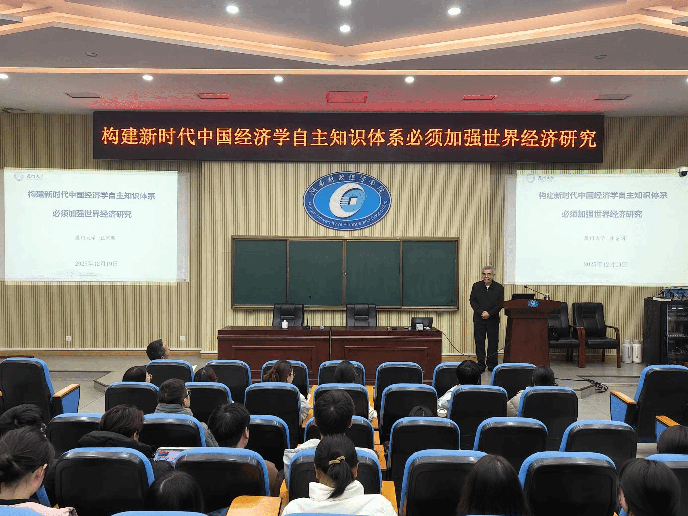 12月19日下午,一场以“构建新时代中国经济学自主知识体系必须加强世界经济研究”为主题的学术讲座在湖南财政经济学院2J02教室开讲。厦门大学经济学院庄宗明教授应邀主讲,为师生们带来经济学领域的深度分享。本次讲座由财政金融学院院长刘辉煌主持,党委书记肖燕飞全程参加。讲座现场 贺慧真 吴睿/摄讲座伊始,庄宗明教授以王亚南的学术探索为切入点,为听众展开了一幅中国经济学从萌芽到迈向新时代自主知识体系构建的宏大画卷。1938年,...