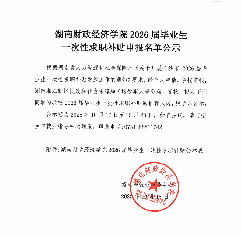 湖南财政经济学院2026届毕业生 一次性求职补贴申报名单公示