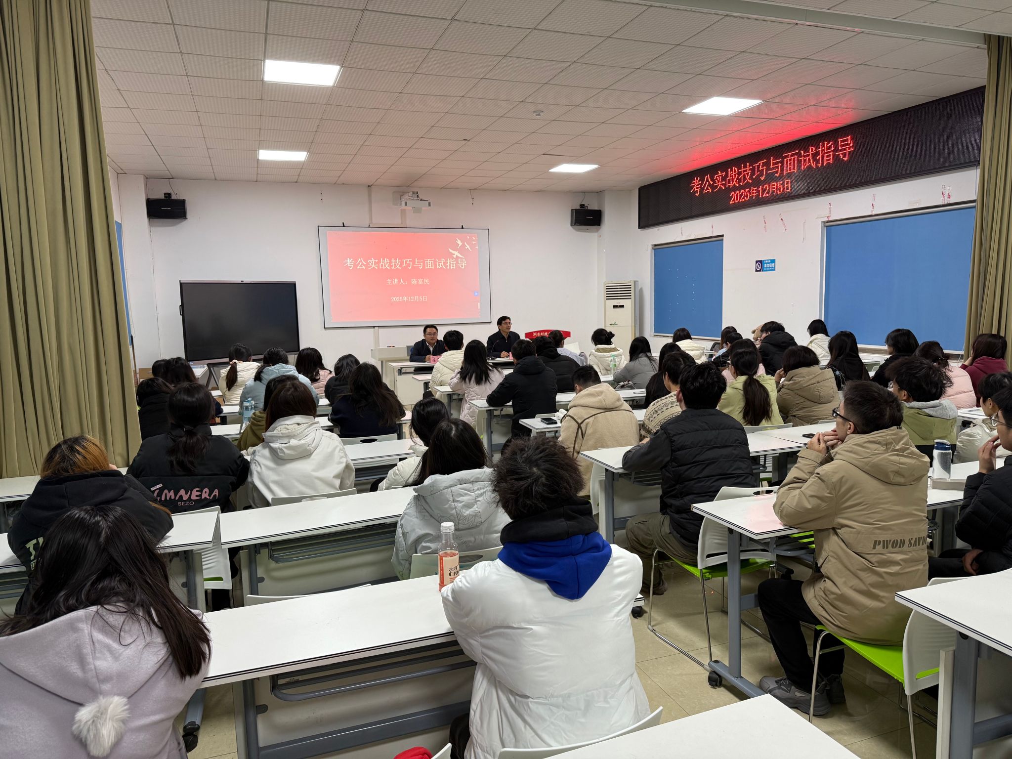 (本网讯)12月5日,招生与就业指导中心特邀2013届优秀校友、现任衡阳市石鼓区统计局局长陈富民回校,以其亲身经历为在校学子深度剖析公务员职业发展之路,助力在校学生考公备考。中心主任刘振强主持讲座。